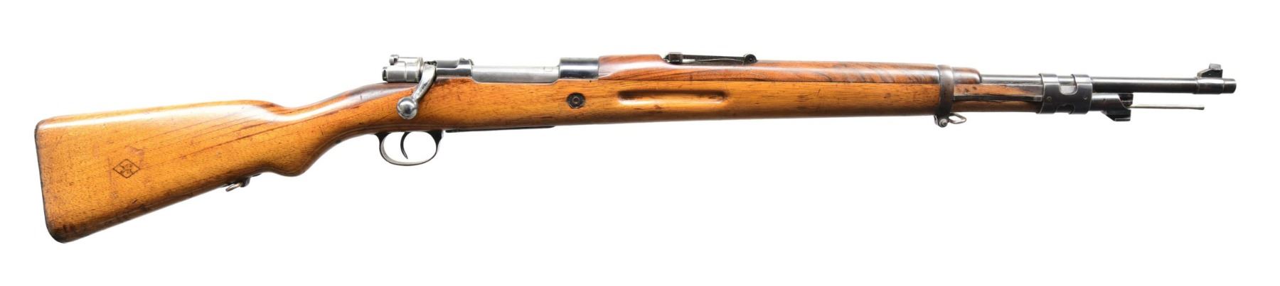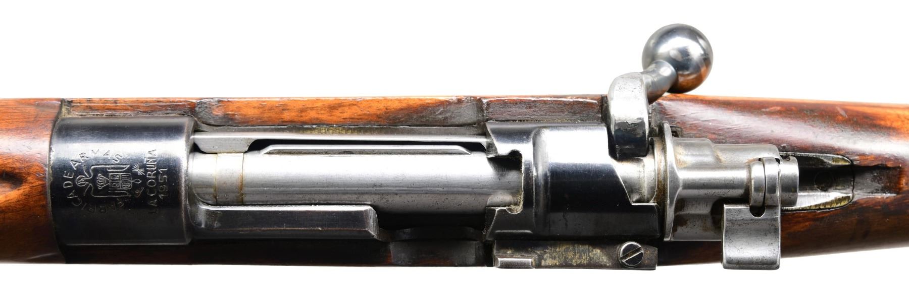 Cal. 8x57 (8mm Mauser). S# T-7109. Bbl. 24". Blade front sight. Tangent rear sight graduated to 2000m. Matching numbers on receiver, trigger guard, and floorplate. Bolt number appears to match, but handle has been altered and turned down. Receiver top has a La Coruna Arsenal marking and 1951 date. Blued finish with polished bolt assembly. Hardwood stock set with left side and bottom-mounted sling provisions. Right side of butt has Spanish cartouche, and right side of stock has added notch for bolt clearance. Cleaning rod present. CONDITION: sanded stock has added finish with some black staining, scattered dings, and handling marks. Bolt appears cleaned with scattered dings, pitting, and oxidation. Balance of metal retains 60% arsenal rework blue with scattered oxidation, fading to gray, and some varnish overruns. Safety will not go all the way in the third position but does work in the middle position; the action otherwise functions properly when hand-cycled. Bore shows scattered oxidation but has strong rifling. (24-3858/MJC). CURIO. $400-600.