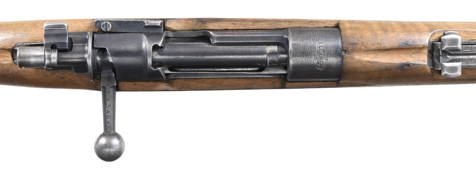 Cal. 8x57 (8mm Mauser). S# EA34646. Bbl. 24". Blade front sight with protective ears. Tangent rear sight graduated to 2000m. All visible matching numbers. Receiver top has Spanish Air Force crest. Blued finish. Hardwood stock set with left side sling provisions. Cleaning rod is present and appears to be a replacement; cleaning rod does not stay in place. CONDITION: stock set has a cleaned appearance with some improper band removal wear, a small crack at the heel, some tape remnants, a few chips, scattered dings, and handling marks. Metal retains 40% arsenal blue with scattered dings, thinning, fading to gray, and oxidation. Action functions properly when hand-cycled. Worn bore with scattered oxidation and some pitting. (24-5027/MJC). CURIO. $400-600.