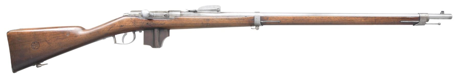 MILITARY RIFLE. Cal. 11.3x51R. S# 2541. Bbl. 32 1/2". Bbl. is dated on the top left flat over chamber "1878". Bbl. has numerous acceptance and proof marks. Additionally, bbl. is marked on the left flat "2541", matching the buttplate. The receiver bolt assembly, mag. follower, and rear sight leaf are all numbered "999". These rifles were originally mfg. as single-shot, and most were later modified to accept the 4-shot Vitali mag. Along with the numbering, the receiver is marked on the left side "P. STEVENS / MAASTRICHT". Mag. cutoff is located on the left side of the receiver. Cleaning rod is present. Walnut stock with a prominent encircled "crown / W / MAASTRICHT / 1878". There is an additional acceptance cartouche. CONDITION: stock set has very good crisp markings, but with wear and numerous handling marks throughout. Notable repaired 4" chip on left side of receiver, which is open at the rear. Metal parts, originally issued bright, are now turning gray with very light scattered oxidation. Mag. has notable patina. Very good, shiny bore with sharp lands. (01-25888/RW). ANTIQUE. $400-600.