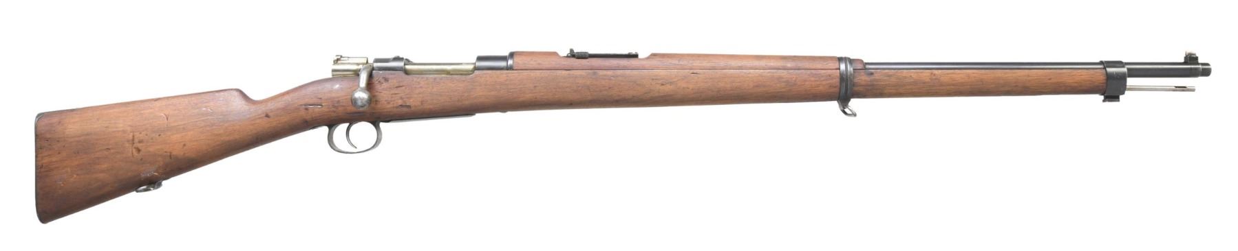 Cal. 7x57 (7mm Mauser). S# C655. Bbl. 29". Blade front sight. Ladder rear sight graduated to 2000m. Rear sight and turned-down C prefix bolt are mismatched. Other visible parts are matching to the receiver, including the cleaning rod. The C-block 1895 Chilean Mauser was originally intended for sale to the Boers, but they were unable to be delivered due to the British blockade. Left side of receiver has DWM markings. Receiver top has Chilean crest. Blued finish. Walnut stock set with bottom-mounted sling swivels. CONDITION: sanded stock set shows four plugs on left side of action, some light chips, scattered dings, and handling marks. Metal retains 85% arsenal blue with some fading, oxidation, dried grease, and edge wear. Action functions properly when hand-cycled. Good, bright bore with some light pitting and scattered frosting. (24-5030/MJC). CURIO. $300-500.