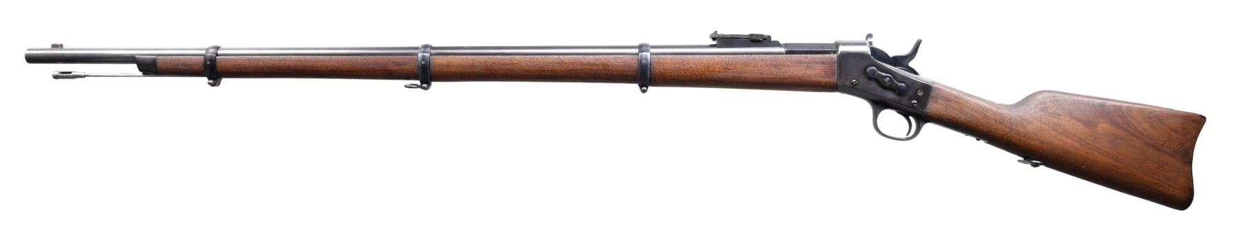 SINGLE SHOT MILITARY RIFLE. Cal. 43 Spanish. NSN. Bbl. 32". Bayonet bar on right side of bbl. Ladder rear sight graduated to 1,300 meters. Stud-type front sight. Receiver has faint Remington markings, including patent dates on top tang. Argentine markings have been scrubbed from the octagon bbl. reinforce. Rotary extractor. Cleaning rod is present. Walnut stock set. Forend held by three clamping bands. CONDITION: stock set has lightly worn arsenal rework-type finish with scattered handling marks. Buttstock has several small cracks on the left side behind the receiver. Metal retains most of its arsenal-reworked blue finish with light wear. Very good, shiny bore with sharp lands and a slight appearance of frosting near the breech area. (01-25883/RW). ANTIQUE. $400-600.
