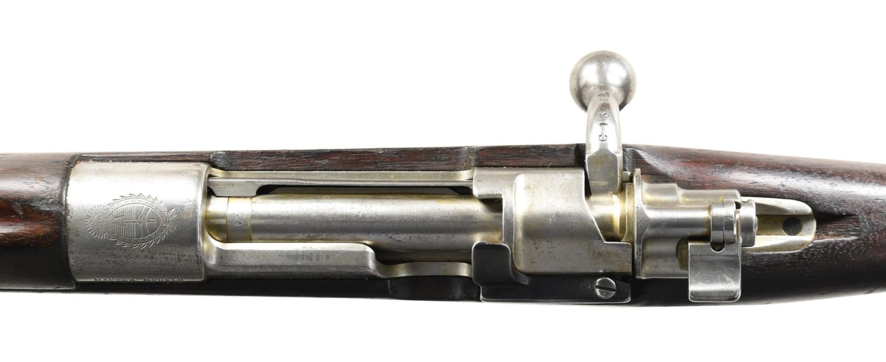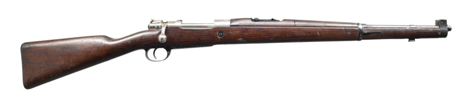 Cal. 7.65 Arg. S# C1366. Bbl. 23". Blade front sight with protective ears. Tangent rear sight graduated to 1400m. All visible matching numbers. Bbl. has "7.65mm" markings on both sides ahead of the handguard. Receiver top has bold Argentine crest. Left side of receiver has "MAUSER MODELO ARGENTINO 1909" and DWM markings. Receiver, buttplate, and bolt are in-the-white; the balance of other parts is blued. Walnut stock set with left side sling provisions. Right side of butt has circled "A" cartouche. CONDITION: stock has an outline of a large sticker ahead of the bottom metal, and the rear right of the handguard has an armorer patch repair. stock set otherwise shows a few moderate chips, scattered dings, and handling marks. Receiver and bolt remain partially bright with some scattered pitting, oxidation, and light dings. Buttplate has a mostly gray patina with oxidation staining. Blued parts retain 50% original finish with overall fading to gray, edge wear, scattered light pitting, and oxidation. Action functions properly when hand-cycled. Very good, bright bore. (24-5029/MJC). CURIO. $400-600.
