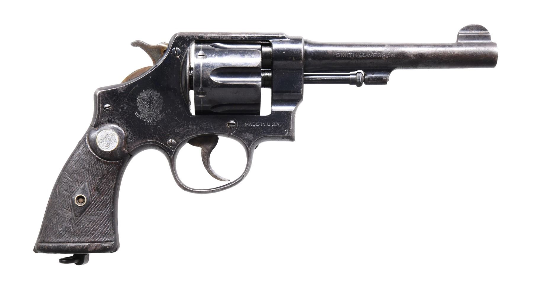 Cal. 45 ACP. S# 204866. Bbl. 5 1/2". Round blade front sight. Fixed rear sight. Matching numbers on frame, bbl., cyl., and extractor. Right rear of frame has Brazilian crest with 1937 date. Backstrap has a "23459" number. Blued finish with case-colored trigger and hammer. Lanyard ring is present on the bottom of the grip frame. Checkered hardwood grips with silver S&W medallions. Grip screw is damaged and not moving. CONDITION: grips show overall heavy checkering wear, a couple chips, scattered dings, and handling marks. Trigger and hammer have mostly faded to gray with traces of case colors and scattered oxidation. Balance of metal retains 40% original blue with scattered fading to gray, edge wear, pitting, and oxidation. Action appears to function properly when hand-cycled. Very good, bright bore, with some light pitting but strong rifling. (24-5146/MJC). CURIO. $300-500.