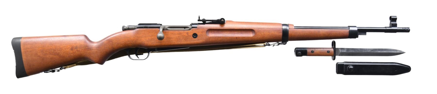 RIFLE WITH MATCHING BAYONET. Cal. 30-06. S# 6093-58. Bbl. 23 3/8". Rifle and bayonet appear unissued. Rifle has circular disc on left side with crisp Colombian crest. Receiver ring is marked on top "FUERZAS ARMADAS DE COLOMBIA". Marked on left rail "MADSEN M. G/A. / Cal. 30". Fully adj. aperture rear sight graduated to 900 meters. Post front sight with protective hood. Bbl. fitted with an integral drilled flash suppressor. Bayonet lug is present. Hardwood stock set. Buttstock has grooved rubber buttplate, bottom swivels, and original green web sling. UNATTACHED ACCESSORIES: matching bayonet with 8 1/4" double-edged blade. Bayonet marked only with serial number. Hardwood grips. Black metal scabbard. Bayonet with bright blade retains most of its original finish with loss of finish around edges of crossguard. CONDITION: wood and metal retain nearly all of their original condition, with very light high-point wear and tiny scattered handling marks. Bright, near excellent, shiny bore. (24-5992/RW). CURIO. $400-600.