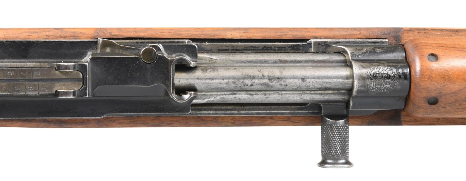Cal. 7x57 Mauser. S# 210. Bbl. 25 3/4", and includes an improperly threaded aftermarket flash suppressor. Receiver is marked on top with Venezuelan crest. Receiver has scope mounting dovetail on left side. Tangent aperture rear sight graduated to 1000 meters. Blade front sight with protective ears. Bayonet lug is present. Bottom swivels. European walnut stock set with stamped grooved buttplate. CONDITION: stock set has light wear and scattered small handling marks. Metal retains 60% of its well-worn original black finish. Bore has a lightly frosted appearance with strong lands. (24-5056/RW). MODERN. $600-900.