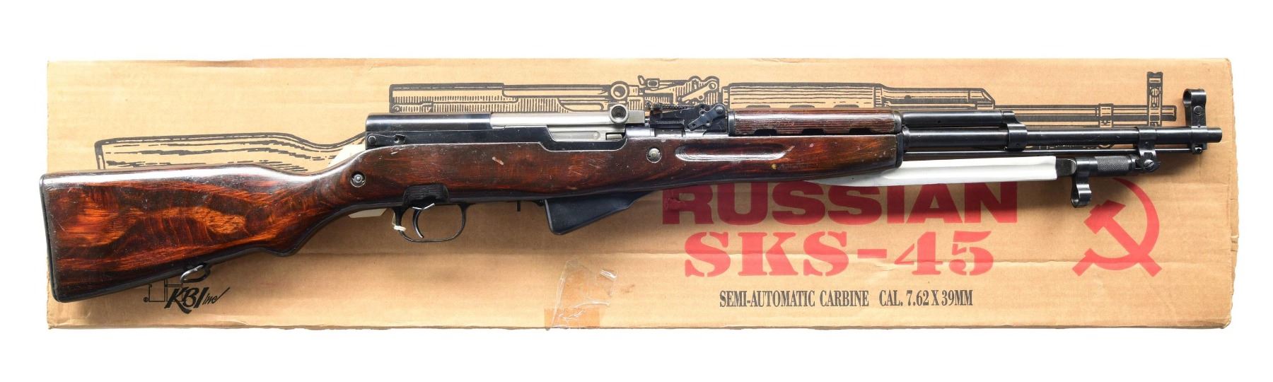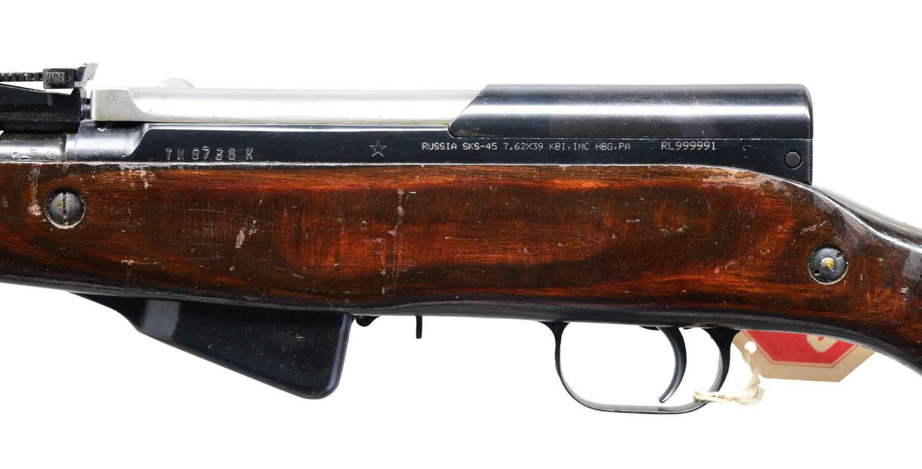 Cal. 7.62x39. S# RL999991. The original S# is TN8736K; this number is matching wherever visible; the "K" suffix indicates manufacture in 1958. The receiver is additionally marked on the left side with the Tula Arsenal 5-pointed star. Bbl. 20 1/2". Import marked on left side of receiver. Receiver cover is unmarked. Tangent rear sight graduated to 1,000 meters. Post front sight with protective hood. Cleaning rod is present. 9 1/2" blade folding bayonet. Laminated hardwood stock set; the 2nd reinforcing bolt is located at the upper end of the grip. Trap-type buttplate. UNATTACHED ACCESSORIES: matching cardboard shipping box from K.B.I. Incorporated. Green web sling, brown pebble grain ammunition pouch, 2-compartment oiler in leatherette pouch, three stripper clips, and cleaning kit. Warranty and safety tags. CONDITION: rifle has a light to moderately worn arsenal rework finish on both wood and metal with scattered scratches and handling marks. Very good, shiny bore. PROVANANCE: from the lifelong collection of Terrence McCarty. (24-387/RW). CURIO. $400-600.