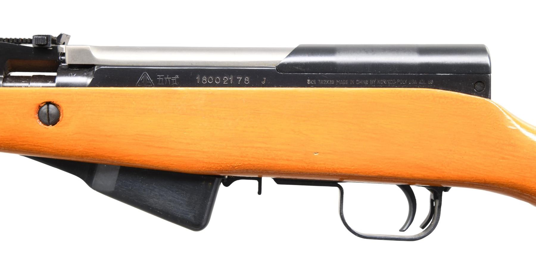 Cal. 7.62x39. S# 18002178J. All visible numbers match. Bbl. 20 1/2". According to the collectors guide to the SKS by Layman, these rifles are seldom seen. The S# seems to indicate a mfg. date of 1975. The receiver is marked on the left side with the triangle 316 followed by three Chinese characters. Import mark on left side of receiver. Tangent rear sight graduated to 1,000 meters. Post front sight with protective hood. Cleaning rod is present. 12 1/4" folding spike bayonet. The unmarked hardwood stock set has a distinctive orange finish. The buttstock has the correct left side swivel. UNATTACHED ACCESSORIES: matching cardboard shipping box. CONDITION: all aspects of wood and metal are near excellent with only tiny scattered handling marks. Very good, shiny bore with sharp lands. PROVENANCE: from the lifelong collection of Terrence McCarty. (24-442/RW). MODERN. $300-400.