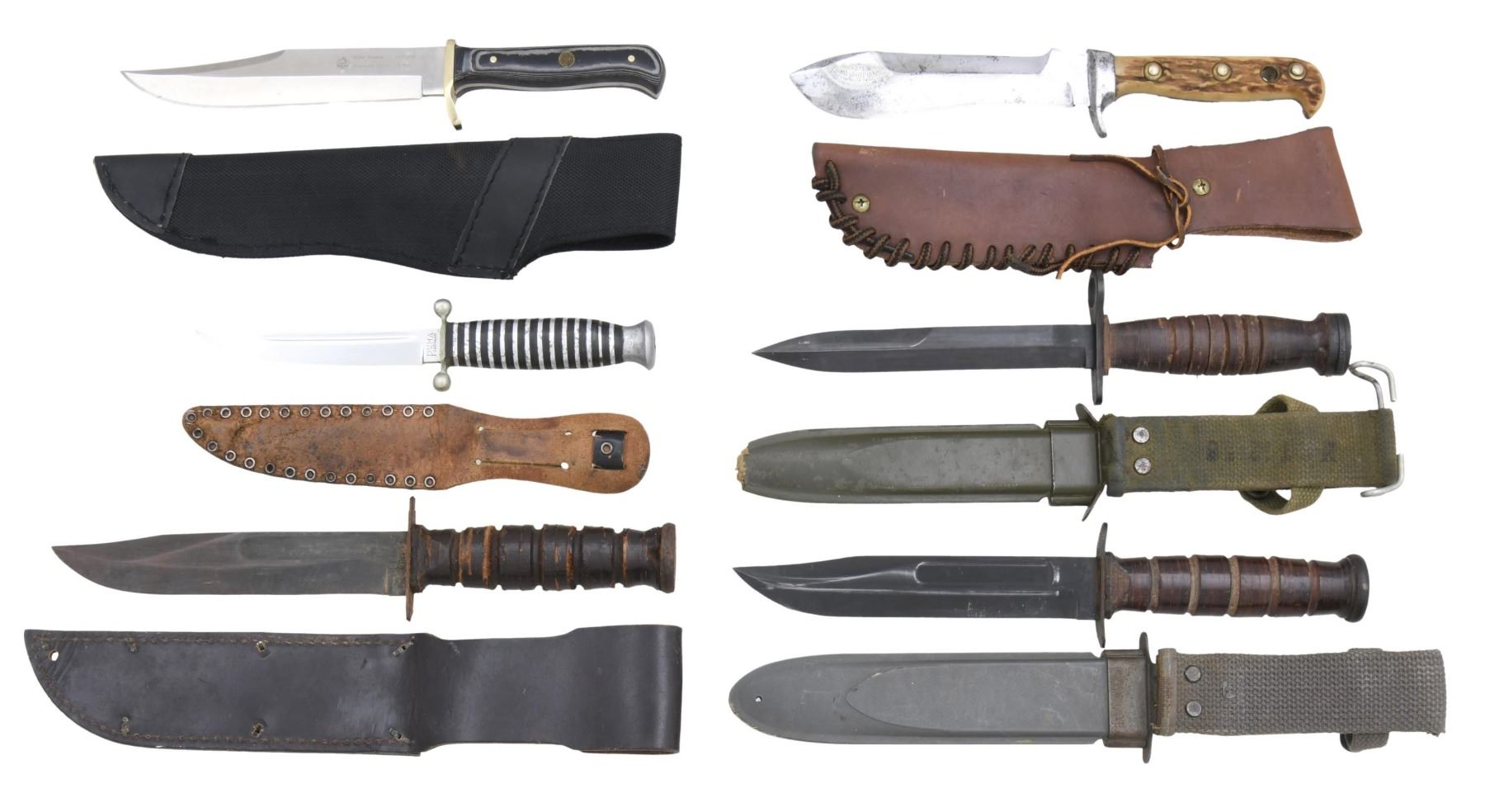 This lot consists of 1 US M4 bayonet with a darkened blade, marked under the crossguard "US M4 K1" and marked on top of the crossguard with a flaming bomb. Stacked leather washer grip with standard pommel. Scabbard is a U.S. M8 type made by B.M. Co. / 1 USN Mark 2 fighting knife with a darkened blade. The underside of the guard is marked "U.S.N MARK 2 CAMILLUS, NY". Stacked leather washer grip. Correct USN Mark 2 sheath. / 1 USN-style Mark 2 fighting knife with a darkened blade, marked at the ricasso "U.S. CAMILLUS". Stacked leather washer grip. Black leather sheath. / 1 Civilian skinning knife, measuring 10 3/4" overall. The flat near the point is marked "6377 PUMA WHITE HUNTER GENUINE PUMASTER STEEL GERMANY". Steel guard with two-piece horn grip. Leather sheath. / 1 Small belt knife measuring 9" overall with the blade marked "PUMA SOLINGEN" and "ROSTFREI GERMANY". Small guard with globular terminals. Stacked composite and metal grip with aluminum pommel. Black leather sheath, marked "PUMA". / 1 Bowie knife measuring 10 7/8" overall with the blade marked "(logo) SGB Bowie 6116386 German steel 15\RC". Plated guard and two-piece micarta grip with a small puma medallion. Leather and canvas puma sheath. CONDITION: military knives generally show moderate wear. Civilian knives show light wear. (02-23215-2/BF). $300-450.