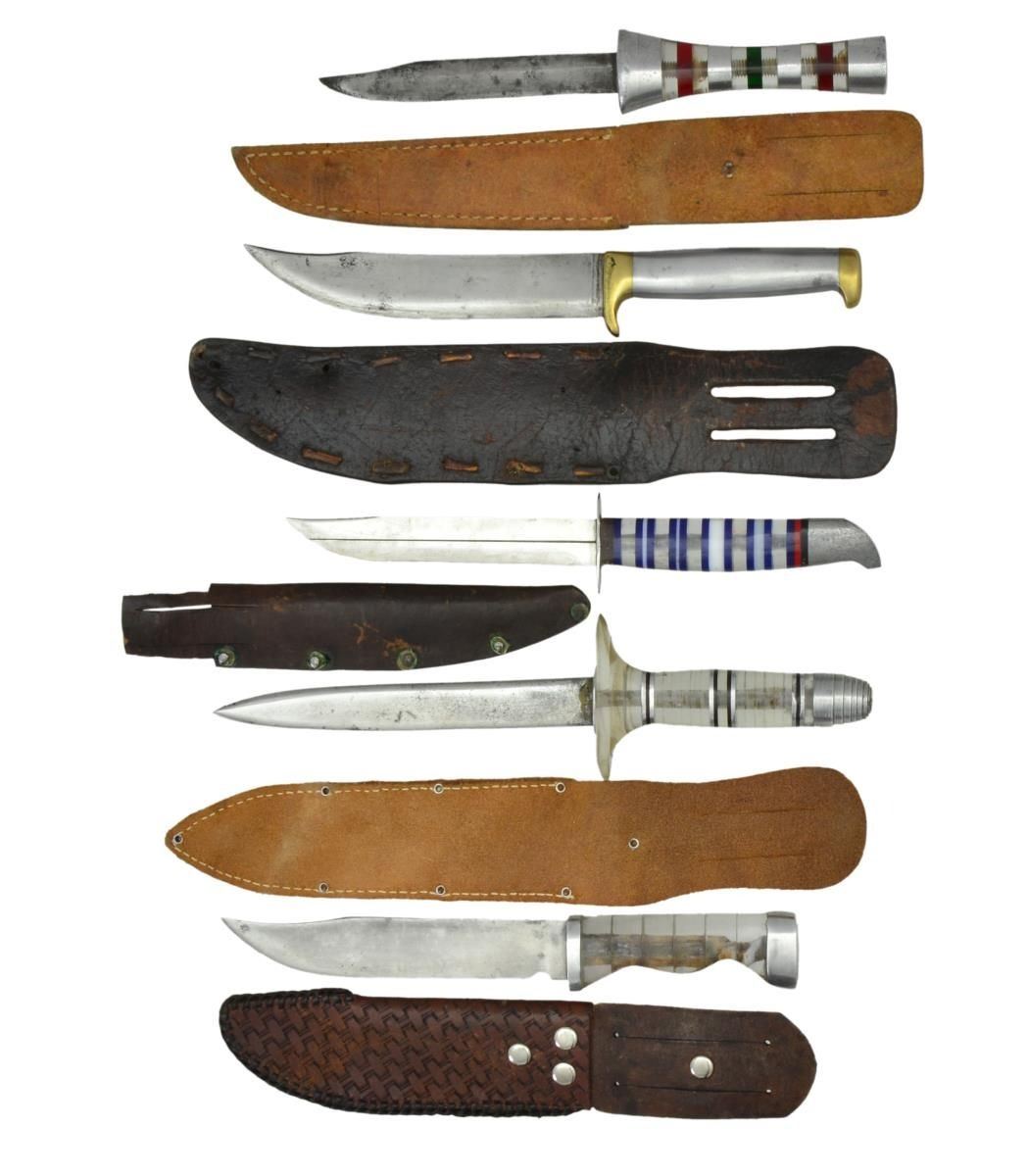 1) Measuring 10.5" overall with a 6" clip point blade, this knife has a smooth polished aluminum grip, heavy cast brass guard & pommel, and is housed in a heavy, brown leather, buck-stitched, riveted sheath 2) Measuring 10" overall with a 5.25" clip point blade, this knife has a stacked blue, white, red, and clear plastic washer grip, an aluminum bird's head pommel, and is housed in a riveted, brown leather sheath with a cut-out belt loop, which was simply made in the field but does the job. 3) Measuring 11" overall with a 6.5" dagger-point blade, this knife's aluminum pommel is atop a stacked clear plastic washer grip with red plastic and aluminum accents and is housed in a brown leather, snap-loop sheath. 4) Measuring 9.5" overall with a 5.5" clip-point blade, this knife has a stacked, thick, clear plastic grip with an aluminum bolster & pommel and is housed in a tooled leather sheath with "EK" initials. 5) Measuring 9.5" overall with a 5" narrow clip-point dagger blade, this knife has a stacked aluminum red, dark green, and clear plastic washer grip and is housed in a brown leather, "dagger"-embossed, snap-loop sheath. CONDITION: knives are in very good overall condition. PROVENANCE: from the Roger Ballard collection. (02-21316/JS). $500-700.
