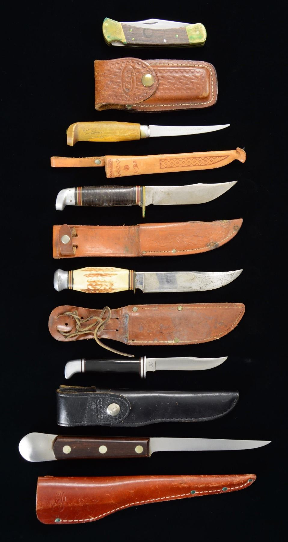 Lot of 6 assorted knives, including: 1) Case 124-6 fillet knife. Stainless steel construction with 2-piece smooth wood scales. Blade measures 6", with an overall length of 18 1/8". UNATTACHED ACCESSORIES: Case brown leather sheath. CONDITION: very good, with scattered superficial marks, some wear, as well as some flecks of light surface oxidation. Scabbard remains malleable, exhibiting some crazing overall. 2) Fillet knive marked "Reece" on the right side of the handle. Right side of blade appears to be inscribed "Marttirm Finland". Blade measures 4 7/8", with an overall length of 7 3/4". UNATTACHED ACCESSORIES: brown leather sheath marked "Made in Finland". CONDITION: knife is good, save for a chip at the point. Handle exhibits some cracking, with the blade being loose. Sheath remains malleable, exhibiting mild wear and handle marks overall. 3) Buck 102 Woodsman clipped point knife. Right side of ricasso is marked "BUCK/ 102/ U.S.A.". 1-piece black synthetic handle, with aluminum pommel and guard. Blade measures 4", with an overall length of 7 7/8". UNATTACHED ACCESSORIES: Buck black leather scabbard. CONDITION: very good, with some scattered handling marks overall. Blade edge shows some sharpening marks, but is otherwise fine. Sheath remains malleable, exhibiting some scattered handling marks and minor edge wear. 4) Buck 110 folding clip point knife. Left side of the ricasso is marked "BUCK/ 110/ U.S.A.". 2-piece smooth wood scales, with brass bolster and pommel. Blade measures 3 3/4", with an overall length of 8 5/8". UNATTACHED ACCESSORIES: brown leather Case pouch. CONDTIION: good, with some wear, handling marks, and oxidation overall. Brass shows scattered spots of verdigris. Pouch remains malleable, exhibiting scattered handling marks, as well as some crazing overall. 5) Jawika fixed clip point knife. Left side of the ricasso is marked with the Jawica logo, followed by "Jawica/ REPUBLIC OF/ IRELAND". 1-piece stag handle with black, white, and red spacers, a brass guard, as well as an aluminum pommel. Blade measures 5 1/4", with an overall length of 9". UNATTACHED ACCESSORIES: brown leather sheath. CONDITION: blade exhibits scattered marks, sharpening marks, as well as areas of pitting. Sheath remains malleable, exhibiting some losses to the stitching and wear overall. Sheath is missing its top left eyelet. 6) Western fixed clip point knife. Left side of the ricasso is marked "WESTERN/ BOULDER, COLO./ U.S.A.". Handle is comprised of leather rings, with black, white, and red spacers. Brass half guard, with aluminum pommel. Blade measures 4 1/2", with an overall length of 8 3/4". UNATTACHED ACCESSORIES: brown leather sheath, embellished in a Germanic acorn and oak leaf pattern. CONDITION: blade exhibits some discoloration, as well as some scattered spots of pitting. Handle shows scattered handling marks, but otherwise remains sturdy and serviceable. Brass guard exhibits verdigris. Sheath remains malleable, exhibiting wear, several holes, as well as some areas of discoloration. (02-22973/MLW). $100-200.