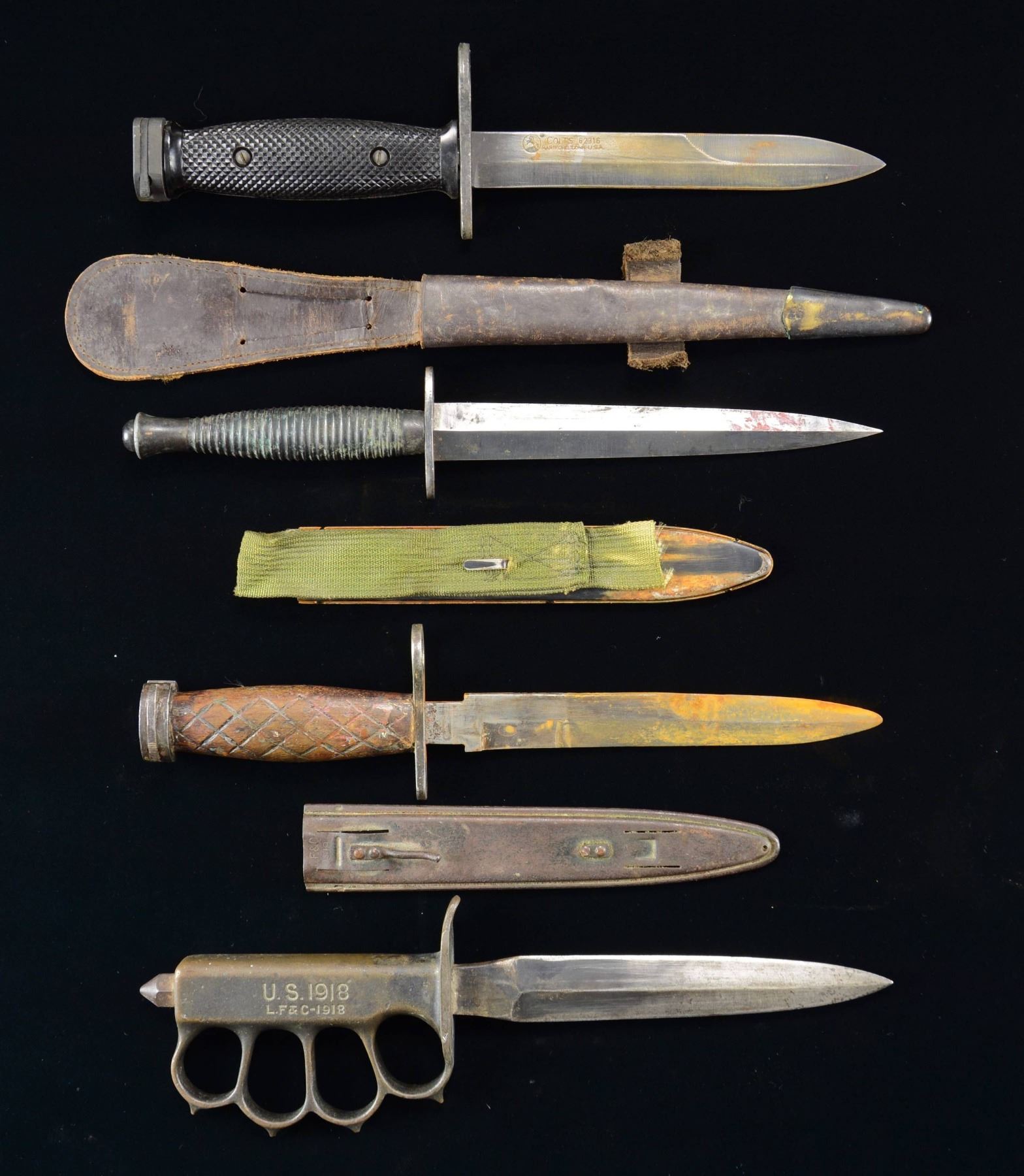 1) TRENCH KNIFE. Overall length: 12 1/4". A good example of a US Mark 1 trench knife of the WWI era. Blade has a darkened finish with a brass hilt showing four studded finger loops, along with a skull crusher nut at the pommel. The grip area is marked "U. S. 1918 L.F & C-1918". Iron sheath. CONDITION: blade has about 50% blued finish remaining. Hilt has a pleasing patina. Sheath is a bit oxidized and is missing one of the securing pins. 2) FAIRBAIRN SYKES. A classic WWII commando knife measuring 13 1/2" overall with sheath. Blued blade measures 6 7/8". Blued crossguard stamped "ENGLAND". Ridged grip with raised pommel. Leather sheath with brass tip. A late-war example issued to and bought by many US troops. CONDITION: blade shows a few spots of oxidation. Hilt has a pleasing patina. Sheath is complete but a bit dirty. 3) M4 BAYONET. A US M4 bayonet, remanufactured into a fighting knife, measuring 11 1/2" overall. Plain, blued blade with crossguard marked "(flaming bomb) U.S. M4 IMPERIAL". One-piece wooden grip with crosshatching. Standard pommel. Sheet iron sheath with nylon suspension strap. CONDITION: blade is a bit rusty. Hilt is rough but functional. Sheath also shows a bit of oxidation. 4) M7 BAYONET. A US M7 bayonet with a plain, blued blade stamped "(logo) COLT’S 62316 HARTFORD, CONN. U.S.A." The guard is stamped "U.S. M7". Two-piece composite grip. Standard pommel. No sheath. CONDITION: light wear overall. (02-22922-8/BF). $600-800.