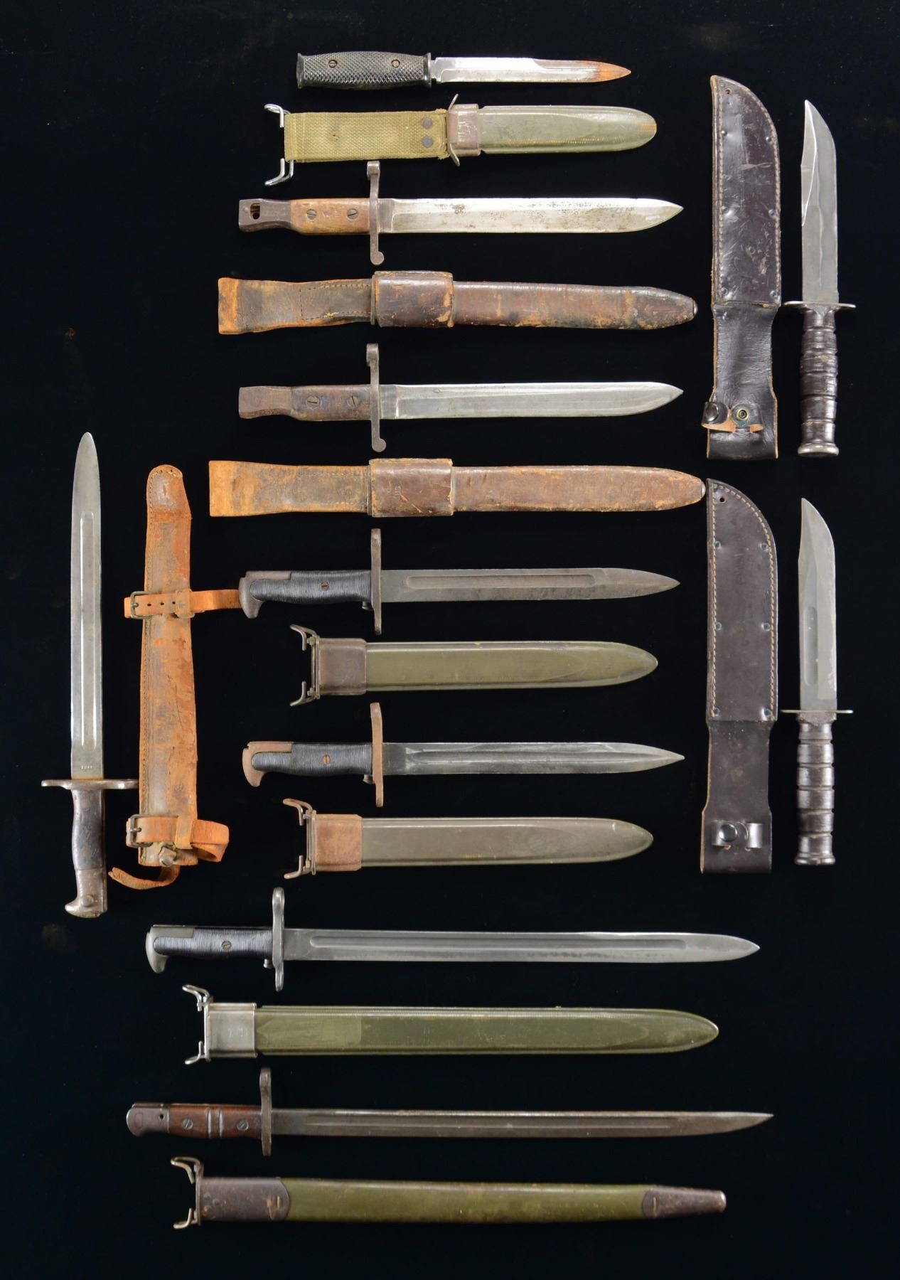 This lot consists of the following bayonets: 1) US Marked Ross 1908 Bayonet. Hardwood grips have US flaming bomb marking. Pommel button is missing. Frog & US marked leather frog present. CONDITION: grips show scattered dings & handling wear. Pommel & crossguard are a gray patina with scattered oxidation & pitting. The muzzle ring having appears deformed in shape. Blade has a cleaned appearance with scattered oxidation & pitting. Frog & scabbard show scattered flaking & crazing. 2) US Marked Ross 1908 Bayonet. Hardwood grips have US flaming bomb marking. Frog & US marked leather frog present. CONDITION: handles show scattered dings & handling wear. Pommel & trigger guard are a dull gray patina with scattered oxidation. Blade is a silvery gray color with scattered oxidation. Frog & scabbard show scattered flaking, dings & crazing. 3) US M1917 Bayonet. Remington made US M1917 bayonet dated 1917 with green scabbard. Hardwood grooved handles. CONDITION: handles show dings & handling wear. Parkerized parts of bayonet show scattered oxidation, edge wear & fading. Scabbard shows scattered flaking & crazing. 4) US 1905 Bayonet. PAL made & 1943 dated M1905 bayonet. Parkerized finish. Grooved blade handles. Green scabbard. CONDITION: grips show scattered dings & staining. Blade appears sharpened with edge wear. Crossguard & pommel retain most parkerized finish with some edge wear. Scabbard throat has added name & appears cleaned to bright. Scabbard shows scattered flaking. 5) US M1 Bayonet. 1943 UFH bayonet. Black grooved grips panels. Green scabbard. CONDITION: grip panels show handling wear & dirt staining. Blade shows scattered edge wear & oxidation. Other metal parts of bayonet & throat of scabbard are an oxidized patina. Scabbard shows scattered scuffing. 6) US M1 Bayonet. PAL made bayonet. Parkerized finish. Grooved black finish. Green scabbard. CONDITION: grips show scattered dings & staining. Metal parts of bayonet show scattered oxidation & edge wear. Scabbard shows oxidation on throat & scuffing on body. 7) US M1892 Krag Bayonet. 1899 dated M1892 Springfield Krag Bayonet. Brightly finished metal. Walnut grip panels. Leather picket pin scabbard. CONDITION: grips show heavy dings & handling wear. Metal is a gray oxidized patina. Scabbard has carved initials with overall flaking & crazing. 8) Modified US Bayonet. Appears to be a modified M4 or M7 bayonet with removed pommel & crossguard. Black grip panels. Green scabbard & canvas frog. CONDITION: grip panels show scattered dings & chipping. Blade shows scattered oxidation. Scabbard shows heavy wear & oxidation. 9) Camillus Ka-Bar Style Fighting Knife. Knife resembles a Ka-Bar knife. Parkerized finish. Blade has Camillus markings & crossguard appears cleaned of markings. Black leather handles & scabbard. CONDITION: handles show scattered dings & dirt staining. Blade appears sharpened with heavy edge wear & some oxidation. Scabbard has added name "DON KELLY" in black marker, scattered crazing & flaking. 11. Camillus Ka-Bar Style Fighting Knife. Knife resembles a Ka-Bar knife. Parkerized finish. Blade has Camillus markings & crossguard appears cleaned of markings. Black leather handles & scabbard. CONDITION: grips show some chipping & handling wear. Blade shows scattered edge wear & light oxidation. Scabbard shows scattered dents, scuffing, flaking & crazing. (02-22949-1/MJC). $500-800 for lot.