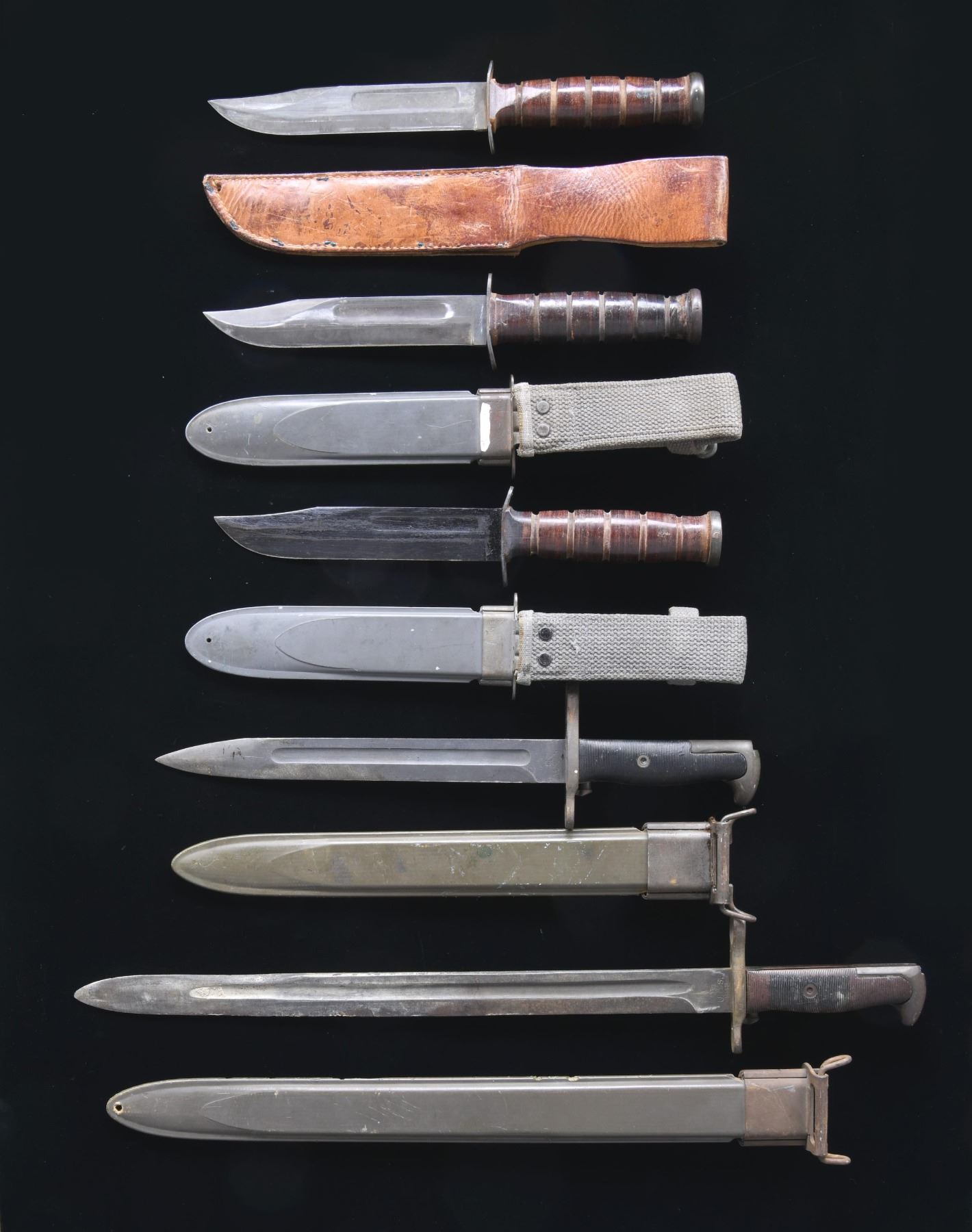 This lot includes 2 USN Mark 2 fighting knives with darkened blades that are marked on the underside of the guards "KA-BAR USN MK2". Compressed leather washer grips with five grooves. Correct sheaths marked "U.S.N. MK 2". / 1 USN Mark 2 fighting knife with a darkened blade that is marked on the underside of the guard "KA-BAR USN MK2". Compressed leather washer grip with five grooves. Brown leather sheath. / 1 US M1942 Springfield bayonet marked at the ricasso "U. (flaming bomb) S. 1942". Two-piece ribbed composite grip. Correct scabbard with minor chipping to the edges. / 1 US M1 rifle bayonet with a darkened blade and two-piece ribbed composite grip. Correct scabbard. CONDITION: all knives and bayonets show light to moderate wear, except as noted above. (02-22686-5/BF). $300-500.