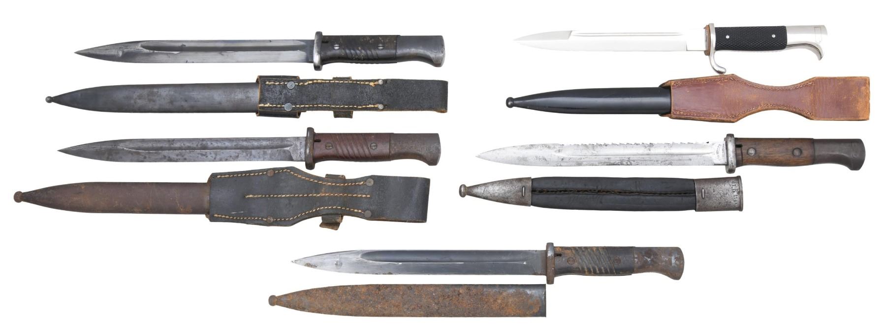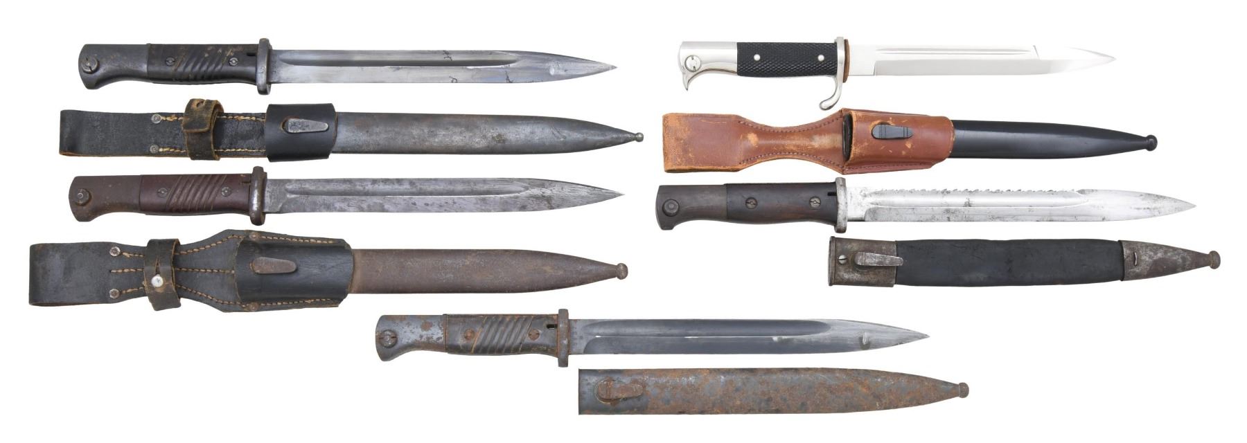 NO.1: German dress bayonet. Bright plated bayonet has a 7 3/4" fullered blade. Blade is marked on right ricasso w/ "F.W. HOLLER" surrounding a thermometer logo. Bayonet has black checkered composite grips held by two pins. Nonfunctional bayonet catch. Bayonet lug groove is filled w/ red felt. Black lacquered steel scabbard w/ unmarked brown leather frog. Blade is equipped w/ leather protector in front of crossguard. CONDITION: bayonet in very good overall condition w/ very light wear. Scabbard retains most of its black finish. Frog has wear & scuffing. Stitching remains tight. NO.2: Imperial German Model 1884/98 2nd pattern sawback bayonet. 9 7/8" fullered blade. Blade is marked on left ricasso "GERR. HELLER / MARIENTHAL". Smooth walnut grip. Flash guard is present. Pommel has faint Imperial "crown" acceptance mark. Black leather scabbard w/ metal throat & tip. Scabbard is marked on back "87. R. 11. 48". CONDITION: bright blade has areas of light oxidation & staining. Blade has been lightly sharpened. Balance of metal turning gray & patina. Grips have wear & staining w/ handling marks. Scabbard has wear & flexing. Stitching is detached. Metal parts have wear & oxidation. NO.3: German WWII M98K bayonet. 10" fullered blade. Blade is marked on left ricasso "W.K.C.". Both ricassos have been ground to remove original markings & finish reapplied. Brown composite grips. Steel scabbard. Black leather frog is marked on back "0-0560-015". CONDITION: unsharpened blued blade has numerous spots of oxidation & fine pitting. Balance of metal has turned patina w/ oxidation & pitting. Grips are worn, but serviceable. Scabbard has oxidation & fine pitting throughout. Leather frog has wear & flexing. Stitching is tight. NO.4: WWII German 98K bayonet. 9 7/8" blued steel fullered blade. Blade is marked on left ricasso "41 / cLc". Right ricasso has serial number. Grooved brown composite grips. 2 German eagle "WAA88?". Steel scabbard w/ brown leather frog. Frog is marked on back w/ "1-8750-0112". CONDITION: bayonet retains 50% of its blued finish w/ wear & light oxidation. Grips have moderate to heavy wear. Scabbard has traces of blue turning overall patina w/ oxidation. Frog has light wear & scuffing. NO.5: German WWII Model 98K bayonet. 9 7/8" blued steel fullered blade. Blade is marked on left ricasso "E FACK & S". Right ricasso has serial number. Brown composite grips. German eagle markings are not legible. Steel scabbard. CONDITION: blade retains traces of worn thinning blue w/ light oxidation. Balance of metal has moderate to heavy oxidation, wear & light pitting. Grips are worn, but remain solid. Scabbard is heavily oxidized w/ light pitting. (02-22949-5/RW). NON-GUNS. $250-450.