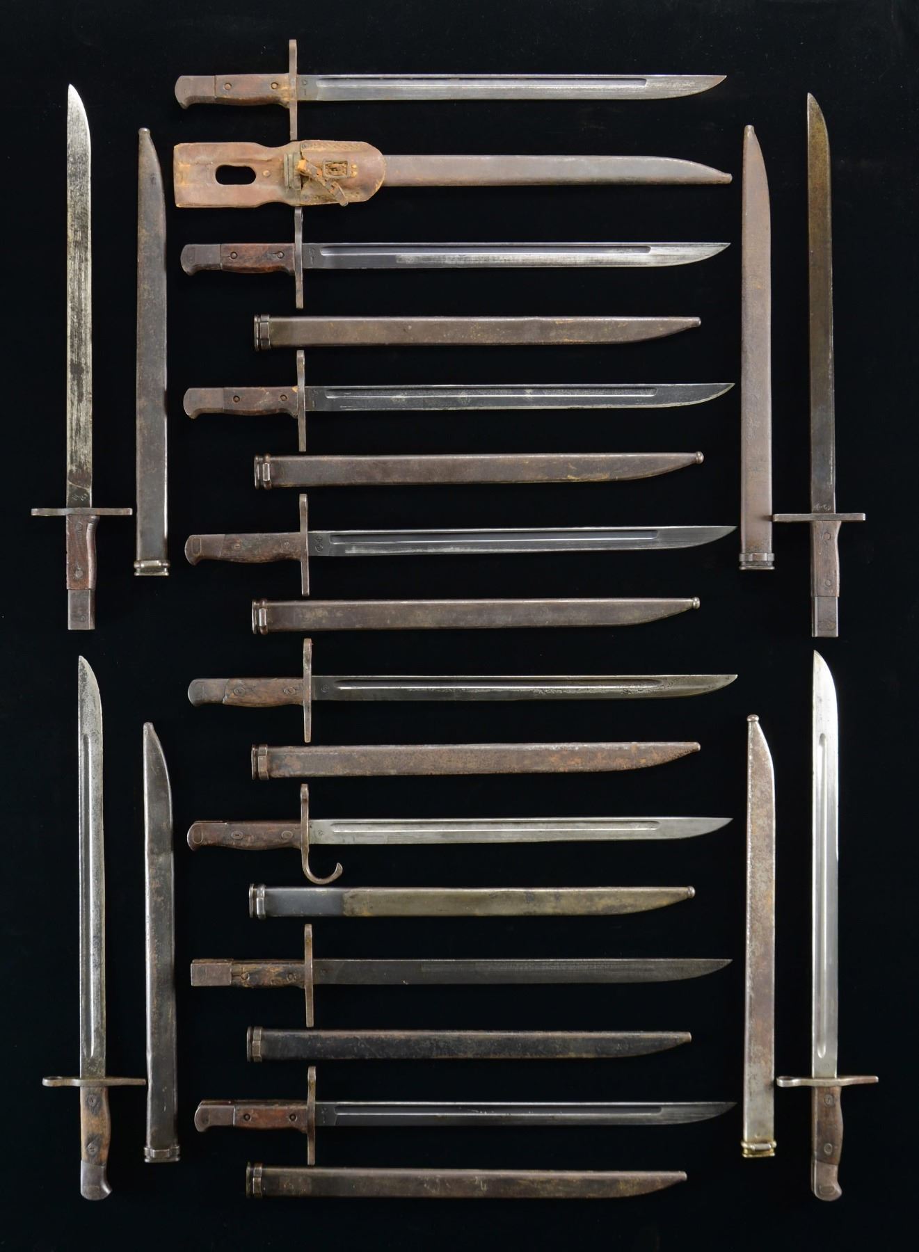 This lot consists of the following Japanese bayonets: 1) Howa Type 30 Bayonet. Straight crossguard & blued finish. Blade has fuller with Nagoya & Howa symbols. Asian hardwood grip panels. Steel scabbard. CONDITION: grips show staining & heavy handling wear. Crossguard, pommel & scabbard are a gray patina with some oxidation. Blade shows scattered edge wear. 2) National Denki under Kokura Supervision Type 30 bayonet. Blued finish & straight crossguard. Fullered blade with Denki & Kokura symbols. Asian hardwood handles. Steel scabbard that is missing its screw. CONDITION: grips show some dings & handling marks. Pommel, crossguard & scabbard are a gray patina with scattered oxidation & some light pitting. Blade shows scattered peppery oxidation & edge wear. 3) Kokura/Tokyo Arsenal Type 30 Bayonet. Hooked crossguard. Brightly finished fullered blade with Kokura/Tokyo arsenal symbol. Asian hardwood grips. Steel scabbard. CONDITION: left grip panel shows several circular indentations, grips otherwise show some chips, flaking & dings. Pommel & crossguard are a dull gray patina with oxidation & some dings. Scabbard shows overall flaking with remnants of blue & some oxidation. Blade remains partially bright with scattered oxidation & dried grease. 4) Jinsen Type 30 Bayonet. Straight crossguard & blued finish bayonet made in Korea under Japanese occupation. Square pommel. Unfullered blade with Jinsen symbol. Asian hardwood grip panels. Black enamel finished scabbard. CONDITION: grip panels show heavy chipping, heavy handling wear, some cracks & flaking. Pommel & crossguard are a dull gray oxidized patina with some pitting & dings. Blade shows scattered edge wear, oxidation & some dings. Scabbard shows scattered flaking & oxidation. 5) Mukden Type 30 Bayonet. Straight crossguard & blued finish. Fullered blade with Mukden symbol. Asian hardwood grip panels. Steel scabbard. CONDITION: grip panels show scattered dings & staining. Crossguard, pommel & scabbard are a dull gray patina with oxidation. Blade shows scattered pitting & edge wear. 6) National Denki under Kokura Supervision Type 30 bayonet. Blued finish & straight crossguard. Fullered blade with Denki & Kokura symbols. Asian hardwood handles. Steel scabbard. CONDITION: grips show some cracks behind rivets, scattered dings, handling marks & staining. Pommel & crossguard are a gray patina with oxidation. Blade shows scattered wear & some light oxidation. Scabbard is a gray patina with some oxidation & a couple dents. 7) Mukden Type 30 Bayonet. Straight crossguard. Fullered blade with Mukden symbol. Asian hardwood grip panels. Steel scabbard. CONDITION: grips show some dents, notable chips, staining & heavy handling wear. Pommel & crossguard show scattered fading to gray, oxidation & pitting. Blade is turning gray with overall pitting. Scabbard shows a few dents, edge wear, pitting & oxidation. 8) Mukden Type 30 Bayonet. Straight crossguard. Brightly finished fullered blade with Mukden symbol. Asian hardwood grip panels. Steel scabbard. CONDITIOON: grips show staining, Pommel, crossguard & scabbard are a gray patina with scattered oxidation & pitting. Blade shows scattered oxidation & dried grease. 9) Late Toyoda Automatic Loom Works under Nagoya supervision Type 30 Bayonet. Blued finish, straight crossguard & square pommel. Unfullered blade with Nagoya & Toyoda symbols. Asian hardwood grip panels. Steel scabbard. CONDITION: right grip panel shows a crack around rivet, grips otherwise show scattered dings, chips & handling wear. Pommel & crossguard are turning gray with oxidation. Blade is mostly a silvery-gray color with traces of bluing & scattered oxidation. Scabbard shows scattered fading to gray, oxidation & edge wear. 10) Late Toyoda Automatic Loom Works under Nagoya supervision Type 30 Bayonet. Blued finish, straight squared crossguard & square pommel. Unfullered blade with Toyoda & Nagoya symbols. Late war scabbard. CONDITION: grips show scattered chipping, flaking, dings & handling wear. Pommel & crossguard show scattered oxidation. Blade shows some fading to gray near tip, scattered edge wear & oxidation. Scabbard shows scattered flaking, some pitting & heavy oxidation. 11) Type 30 Bayonet by National Denki under Kokura supervision. Straight crossguard & blued finish. Fullered blade with Kokura & National Denki symbols. Asian hardwood grip panels. Steel scabbard. CONDITION: grips show a few dents, scattered dings & handling wear. Crossguard & pommel are turning gray with oxidation. Blade shows scattered edge wear & oxidation. Scabbard shows scattered fading, edge wear & oxidation. 12) Type 30 Bayonet by National Denki under Kokura supervision. Straight crossguard & blued finish. Fullered blade with Kokura & National Denki symbols. Asian hardwood grip panels. Steel scabbard & leather frog. CONDITION: grips show notable chipping & some flaking. Crossguard & pommel are a dull gray patina with oxidation. Blade shows overall fading, some edge wear, scattered oxidation & pitting. Frog shows scattered crazing, flaking & dirt staining. Scabbard shows overall fading & scattered oxidation. (02-22949-2/MJC). $700-1000 for lot.
