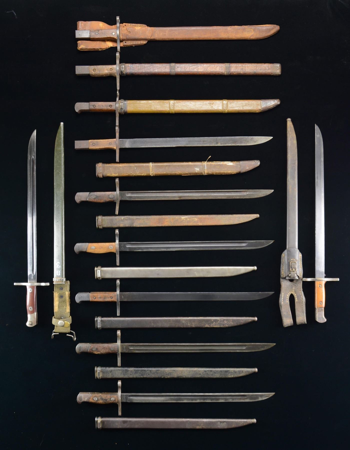 This lot consists of the following Japanese bayonets: 1) Late War Toyoda Automatic Loom Works Type 30 Bayonet. Straight crossguard bayonet with Toyoda Automatic Loom Works & Nagoya markings. Blade without fuller. Blued finish with Asian hardwood handles. Rubberized canvas frog & scabbard present. CONDITION: grips show scattered chipping, notable dents & handling wear. Blued parts of bayonet show scattered light oxidation & edge wear. Frog shows heavy flaking, crazing & missing pieces. Scabbard shows scattered flaking, crazing & staining. 2) Early Toyoda Automatic Loom Works Type 30 Bayonet. Straight crossguard bayonet with fullered blade that has both Toyoda & Nagoya markings. Blued finish. Asian hardwood grips. Steel scabbard. CONDITION: grips show some scattered dings, chips & black staining. Blued parts of bayonet show some edge wear, fading to gray & oxidation. Scabbard appears cleaned to a silvery-gray color with oxidation. 3) Howa Type 30 Bayonet. Straight crossguard bayonet with fullered blade. Blade has Howa & Nagoya markings. Blued finish. Asian hardwood grips. Steel scabbard. CONDITION: grips show scattered dings, dents & handling wear. Metal shows scattered oxidation & edge wear. Other metal parts are a dull gray patina with oxidation. Scabbard shows overall oxidation with scattered traces of bluing. 4) Late War National Denki Type 30 Bayonet. Straight crossguard bayonet. Unfullered blade with National Denki marking. Blued finish. Asian hardwood grips. Green painted wooden scabbard. CONDITION: grips show a couple cracks with some dings, light chips & handling wear. Metal parts are turning to a dull gray patina with dried grease on blade & scattered oxidation. Scabbard shows scattered flaking, dings & some cracks. 5) Late War Jinsen Type 30 Bayonet. Jinsen straight crossguard bayonet with unfullered blade. Blued finish. Asian hardwood grips. Wooden scabbard. CONDITION: grips show scattered flaking, dings & handling wear. Metal parts of bayonet are a gray patina with scattered oxidation. Scabbard shows scattered long cracks, dings & chips. 6) Japanese Type 30 Bayonet by Unknown company under Kokura supervision. Straight crossguard bayonet with unfullered blade. Blade has Kokura & hourglass symbols. Blued finish. Asian hardwood grips. Steel scabbard & leather frog. CONDITION: grips show scattered dings & handling marks. Metal parts of bayonets show edge wear, oxidation & areas turning gray. Scabbard shows scattered fading & oxidation. 7) Late War Toyoda Automatic Loom Works Type 30 Bayonet. Straight crossguard bayonet with Toyoda Automatic Loom Works & Nagoya markings. Blade without fuller. Blued finish with Asian hardwood handles. Wooden scabbard. CONDITION: grips show some flaking & handling wear. Blued parts of bayonet show some oxidation, edge wear & fading to gray. Scabbard shows some cracks, dings & flaking. 8) Mukden Type 30 Bayonet. Straight crossguard bayonet with blued fullered blade. Blade has Mukden symbol. Other metal parts have bright appearance. Brown synthetic handles. Green steel scabbard with US canvas frog that appears to be South Korean with Asian markings. CONDITION: grips show some dings, chipping & handling wear. Pommel & crossguard appear cleaned to bright with oxidation & some dings. Blade shows scattered edge wear & fading. Frog shows scattered staining. Scabbard shows scattered flaking & oxidation. 9) Toyoda Automatic Loom Works Type 30 Bayonet. Straight crossguard bayonet with fullered blade that has both Toyoda & Nagoya markings. Crossguard is bent. Blued finish. Asian hardwood grips. Steel scabbard. CONDITION: grips show some cracks, dings, dents & handling wear. Metal parts of bayonet are mostly a gray patina with scattered oxidation. 10) Late War National Denki Bayonet. Straight crossguard bayonet with unfullered blade. Blade has National Denki symbol. Blued finish. Asian hardwood grips. Steel scabbard. CONDITION: grips show scattered dings & handling marks. Blued parts retain a high degree of their original finish with scattered oxidation & edge wear. Scabbard shows scattered oxidation. 11) Type 30 Bayonet made by Unknown company under Nagoya supervision. Straight crossguard bayonet with fullered blade. Bayonet has Nagoya symbol & star with "K" in the center. Blued finish. Asian hardwood grips. Steel scabbard. CONDITION: grips show scattered dings, staining & dents. Pommel & crossguard are mostly a gray patina with oxidation & some dings. Blade shows scattered thinning, light oxidation & scratches. Scabbard is mostly a gray patina with dents & oxidation. (02-23073-9/MJC). $500-800.