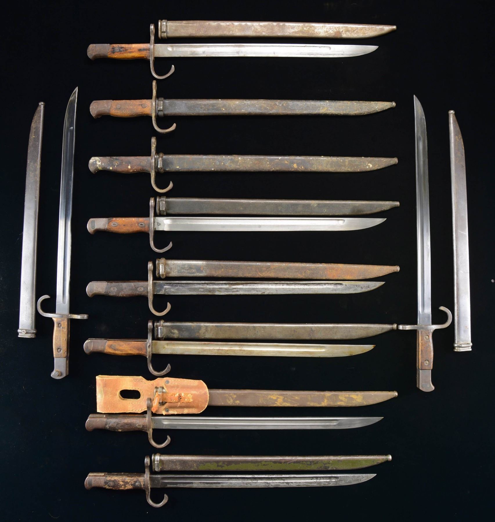 This lot consists of the following Japanese Type 30 bayonets: 1) Training Type 30 Bayonet. Early style bayonet with bright blade & hooked crossguard. No visible arsenal markings on blade. Pommel numbered "180". Asian hardwood grips. One grip panel has faint Kanji stamps. Steel scabbard. CONDITION: grips appear sanded with scratches, staining & dings. Metal is turning gray with scattered oxidation. 2) Kokura Type 30 Bayonet. Early Type 30 bayonet with Kokura/Tokyo arsenal marking & hooked crossguard. Blued finish. Asian hardwood grips. Steel scabbard. CONDITION: crossguard & pommel are a dull gray patina with oxidation. Blade has areas that are devoid of finish with pitting & scattered oxidation. Handles show notable flaking, dings & handling wear. 3) Training Type 30 Bayonet. Early style bayonet with bright blade & hooked crossguard. No visible arsenal markings on blade. Asian hardwood grips. Steel scabbard. CONDITION: crossguard & pommel are a dull gray oxidized patina. Blade remains partially bright with a large amount of dried grease & some oxidation Grips show some chipping, dings & staining. Scabbard is mostly a dull brown oxidized patina with staining. 4) Kokura Type 30 Bayonet. Early Type 30 bayonet with hooked crossguard, rubberized canvas frog & steel scabbard. Blade has bright finish & Kokura/Tokyo arsenal symbol. Asian hardwood handles. Green painted steel scabbard. CONDITION: crossguard & pommel are a dull gray oxidized patina. Blade remains mostly bright with some light oxidation. Handles show scattered roughness, flaking, dings & black staining. Strap of frog is broken & frog shows scattered flaking. Scabbard shows scattered flaking paint, light oxidation & edge wear. 5) Type 30 Bayonet made by National Denki under Kokura supervision. Hooked crossguard & blued blade. Asian hardwood grips. Steel scabbard. CONDITION: metal has areas turning gray with scattered oxidation & edge wear. Grips show a few dents, some dings & handling marks. Scabbard is turning gray with scattered oxidation & pitting. 6) Training Type 30 Bayonet. Early style bayonet with bright blade & hooked crossguard. No visible arsenal markings on blade. Asian hardwood grips. Steel scabbard that is missing its screw . CONDITION: crossguard & pommel are a dull gray patina with oxidation. Blade shows scattered oxidation & dried grease. Grips show scattered cracks, black staining & dings. Scabbard is a gray patina with scattered oxidation. 7) Early Kokura Type 30 Bayonet. Brightly finished blade with Kokura/Tokyo arsenal marking. Hooked crossguard. Asian hardwood grips. Steel scabbard. CONDITION: blade has a large amount of dried grease. Pommel & crossguard area dull gray oxidized patina. Handles show some chip, staining, chips & dings. Scabbard shows shows overall oxidation & some traces of bluing. 8) Type 30 Bayonet made by Unknown company under Kokura supervision. Early bayonet with hooked crossguard. Blued blade with Kokura & unknown subcontractor symbols. Asian hardwood handles. Steel scabbard. CONDITION: blade retains a high degree of arsenal blue with some edge wear & dried grease. Pommel & crossguard are a dull gray patina with oxidation & some pitting. Grips show some staining, dings & handling marks. Scabbard is turning gray with edge wear, oxidation & pitting. 9) Early Kokura Type 30 Bayonet. Brightly finished blade with Kokura/Tokyo arsenal marking. Hooked crossguard. Asian hardwood grips. Steel scabbard. CONDITION: blade remains mostly bright with some light oxidation & dried grease. Pommel & scabbard are a dull gray oxidized patina with some pitting. Grips show scattered dings & staining. Scabbard shows scattered edge wear & oxidation. 10) Early Kokura Type 30 Bayonet. Blued blade with Kokura/Tokyo arsenal marking. Hooked crossguard. Asian hardwood grips. Steel scabbard. CONDITINO: blade shows overall finish loss with edge wear, oxidation & pitting. Crossguard & pommel are a gray patina with oxidation. Grips show dings, staining, chips & a few cracks. Scabbard shows overall finish loss with edge wear, oxidation & pitting. (02-23073-7/MJC). $400-600 for lot.