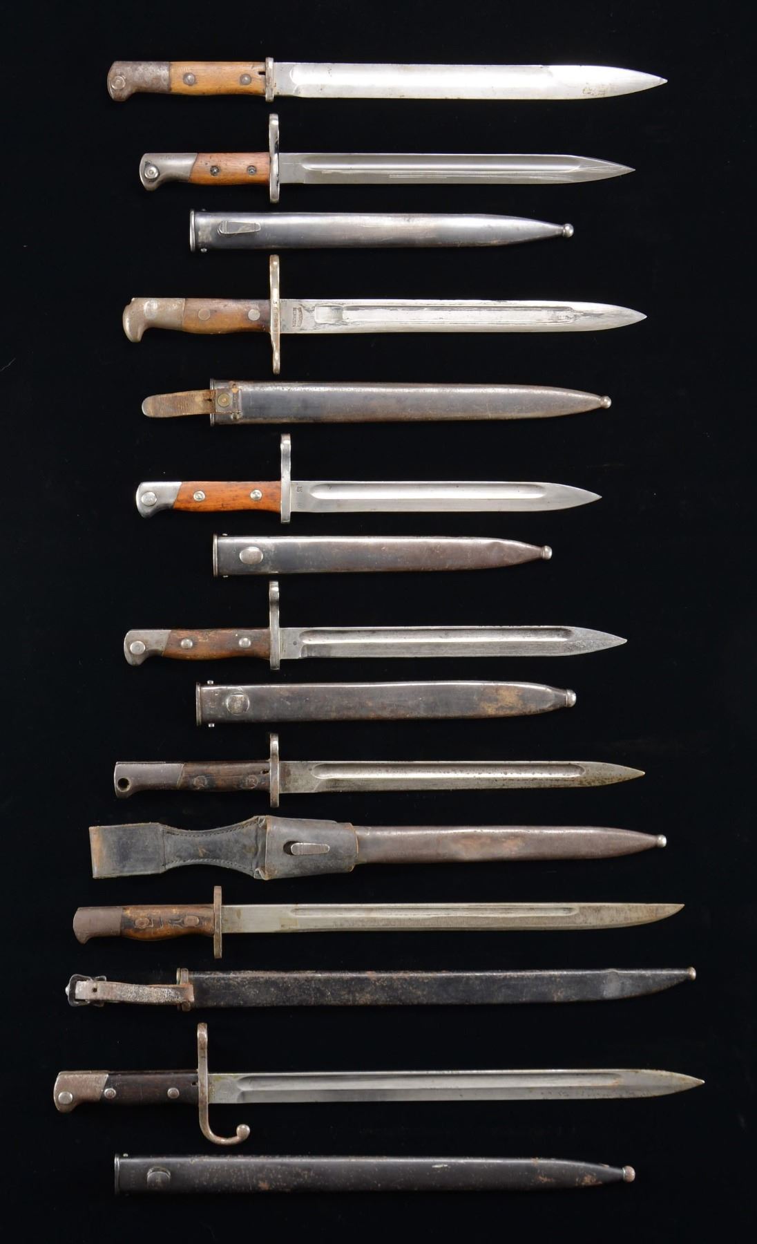 This interesting lot of bayonets includes 1 Mauser WWI-era bayonet with scabbard and frog. Grip has losses, spring is missing, and scabbard and dents. / 1 German M1914 bayonet with a bright blade marked "SAMSON WERK" on the ricasso. No Scabbard. / 1 Argentinian M1909 bayonet and scabbard. The ricasso is marked "MODELO ARGENTINO 1909 (crest) K9457" on one side, and the other is marked "WEYERSBERG KIRSCHBAUM & CIE SOLINGEN". / 1 Swiss M1889 Schmidt-Rubin bayonet and scabbard. Ricasso is marked "WAFFENFABRIK NEUHAUSEN". / 1 Altered Japanese WWII Arisaka bayonet and scabbard made into a fighting knife by altering the guard and filling the slide slot. / 1 Chilean M1895 Mauser bayonet with scabbard. / 2 Export M1895 Mauser bayonets with scabbards. CONDITION: bayonets generally show light wear, except as noted above. (02-22686-3/BF). $400-600.