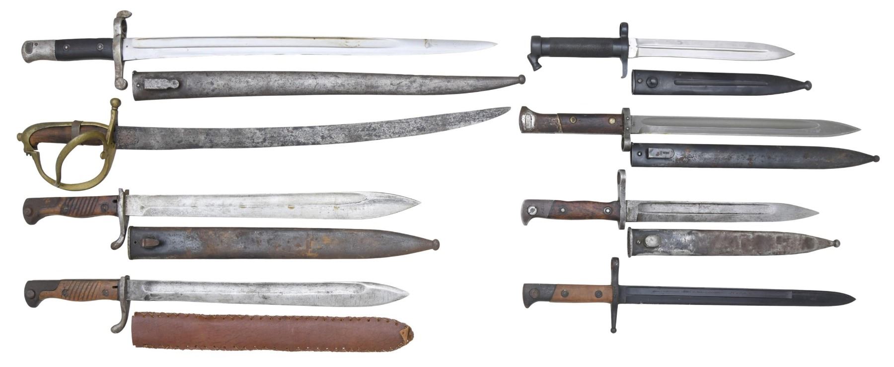 NO.1: European infantry Hanger. Non-fullered blade is unmarked. Hardwood grip has brass back & knuckle bow. The markings on the left side of the knuckle bow appear "R.NO15 A29". CONDITION: sword is well-worn w/ oxidation & light pitting. The hardwood grip is heavily worn w/ cracks. Brass parts have mustard patina w/ wear & staining. NO.2: Portuguese Model 1885 for the Kropatschek rifle. 18 1/2" bright fullered blade. Blade is marked on right ricasso w/ tiny mark resembling back-to-back 3s. Crossguard w/ muzzle ring has serial number, disc finial & auxiliary front sight blade. Smooth walnut grip secured by 2 rivets. Steel scabbard. CONDITION: break blade has spots of discoloration & light oxidation. Balance of metal is turning gray w/ light oxidation. Grips have wear & handling marks. Scabbard has dents w/ oxidation & fine pitting throughout. NO.3: German WWI Model 1898/1905 bayonet. 13 3/4" fullered blade. Blade marked on left ricasso "WAFFENFABRIK / MAUSER AG / OBERNDORF aN". Blade marked on back w/ Imperial "crown / W / 16". Smooth European walnut grips. Hobbyist made brown leather sheath. CONDITION: blade has been sharpened & shows numerous grinding marks w/ wear, oxidation & fine pitting. Balance of metal turning gray & patina. Sheath has damaged tip. NO.4: German WWI Model 1898/1905 bayonet. 14 1/2" fullered blade. Blade is marked on left ricasso w/ "tiny human figure / CORTS SO / REMSCHEID". Back of blade is marked w/ Imperial "crown / W / 15". Walnut grips w/ grooves. Walnut grips w/ slanting grooves. Steel scabbard marked "C.W. 3456.". CONDITION: bright blade has light oxidation & fine pitting turning overall gray. Balance of metal turning gray & patina. Grips have extensive wear, staining and handling marks. Scabbard has traces of blue turning patina w/ notable oxidation. NO.5: Spanish Model 1893 Mauser bayonet. 9 3/4" fullered blade. Blade is marked on left ricasso "OE / WG". Crossguard w/ muzzle ring has serial number. Smooth walnut grips held by 2 rivets. Pommel is marked "ASFA" w/ illegible logo. Steel scabbard. CONDITION: blade is turning gray w/ wear & staining. Balance of metal turning gray w/ numerous dents & scratches. Grips have large missing chip on right side w/ wear & staining. Steel scabbard has large dents, wear & handling marks. NO.6: Czech Post-WWI VZ-22 Mauser bayonet. 11 3/4" fullered blade w/ reverse cutting edge. Blade is marked on left ricasso "CSZ". Right ricasso marked "E / encircled lion / 24". Smooth walnut grips secured by two screws. Blued steel scabbard marked "CSZ" & "E / encircled lion / 24". CONDITION: blade has been sharpened leaving most of the gray phosphate finish intact. Balance of metal turned gray & patina. Grip has light wear & handling marks. Scabbard retains 50% blue w/ oxidation & fine pitting throughout. NO.7: Italian WWII Model 1891 Carcano bayonet. 11 3/4" blued fullered blade. Crossguard w/ ball finial marked on right side "C. GNUTTI-1941". Smooth hardwood grips. Scabbard is not present. CONDITION: bayonet retains 60% original blue finish w/ moderate wear & areas of oxidation & light pitting throughout. NO.8: Swedish Model 1896 bayonet. 8 1/4" fullered blade. Blade is marked on the left ricasso "EJ crown & anchor / AB / 737". Right ricasso has "crown" acceptance mark. Crossguard is marked "16 / 1.27". Additional marking is "NO.247". Knurled blued steel grip. Blued steel scabbard marked "7 / I-13 / NO.147". CONDITION: blade has been sharpened & has scattered small spots of staining on its bright finish. Grip has light wear & scattered handling marks. Scabbard has arsenal rework finish w/ light wear & handling marks. (02-23297-2/RW). NON-GUNS. $400-600.