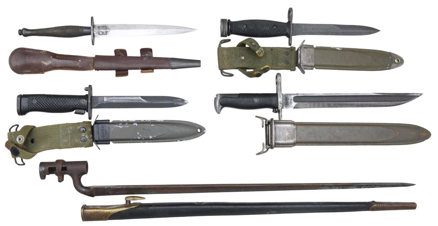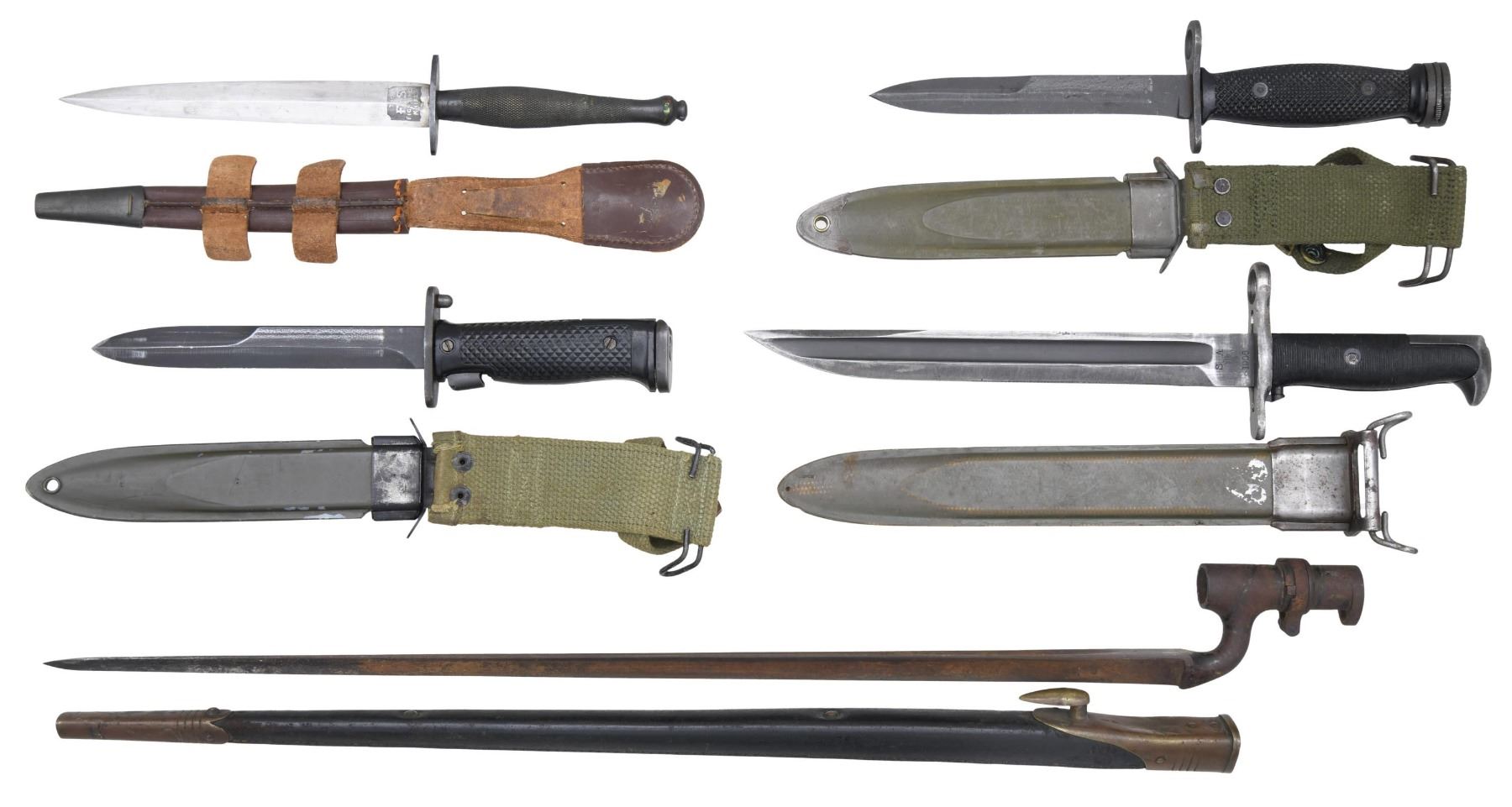 This lot consists of 1 British P1876 Martini Henry bayonet and scabbard. Bayonet has a dark patina and a seam opening on the scabbard. / 1 M4 plastic handle bayonet and scabbard, marked on the underside of the guard "U.S. M4 K.I". Scabbard is a standard US M8A1. / 1 M5 plastic handle bayonet and scabbard, marked on the underside of the guard "U.S. M5A1 MILPAR COL". Scabbard is a standard US M8A1. / 1 US M1905 E1 bayonet with an arsenal-shortened blade. Bayonet is marked at the ricasso "SA (flaming bomb) 1906" and "US 153771". Standard composite scabbard. / 1 Fairbairn Sykes-style fighting knife, marked near the hilt "WILKINSON SWORD CO LONDON" and "THE F-S FIGHTING KNIFE." Blackened brass hilt and guard with crosshatched grip. Brown leather sheath with integral frog. CONDITION: all items show light wear, except as noted. (02-22932/BF). $300-500.