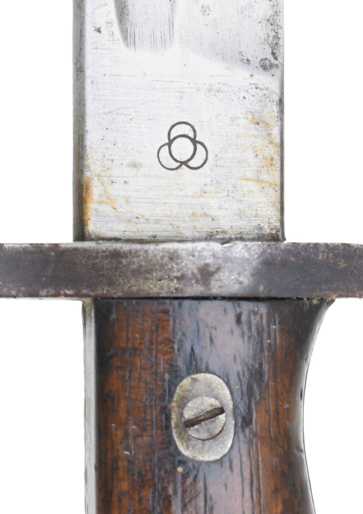1) An Italian M1938 folding bayonet with scabbard, measuring 12 1/4" overall extended. The blade has a single fuller, and the hilt has two wooden grips. CONDITION: light to moderate wear overall. 2) A Siamese M1888 bayonet for a German Model 88 rifle. Bayonet measures 15 1/4" overall. The blued blade has a raised, flat ridge. Two-piece wooden grip and rudimentary bird effigy pommel. Iron scabbard with black leather frog. CONDITION: bayonet shows light wear overall. Frog is quite solid. 3) A WWII Japanese Arisaka bayonet from the Kokura Arsenal measuring 20 5/8" overall. Blade has a single medium fuller. Hilt shows two-piece wooden grips. CONDITION: light wear overall. 4) A Fairbairn Sykes commando knife of the late WWII period. Knife has a blued blade with a raised medial ridge. The elliptical guard is stamped "SHEFFIELD ENGLAND" on the top. Ringed grip with rounded knop on the top. Leather sheath. CONDITION: knife generally shows light wear. Sheath shows light to moderate wear. (02-22962-2/BF). $300-450.