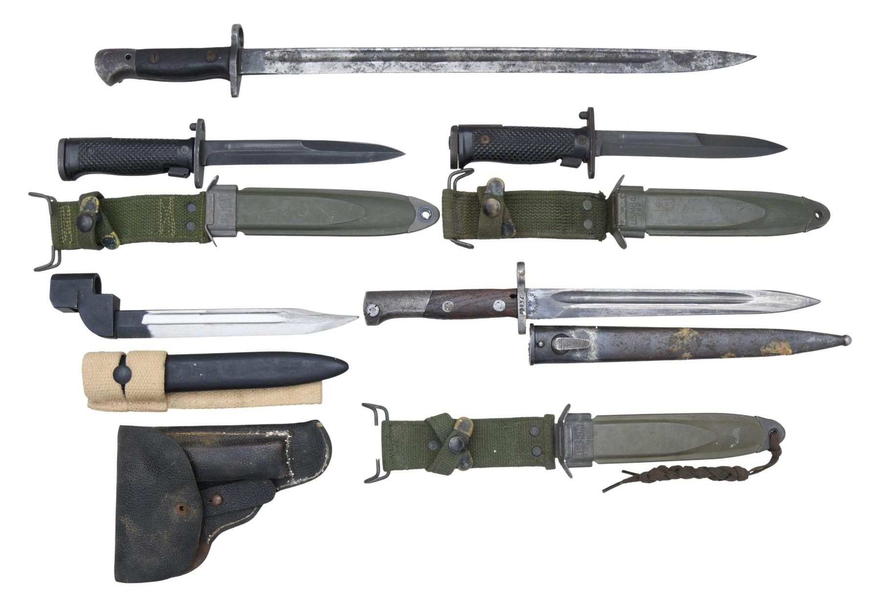 Lot of assorted bayonets and holster, including: 1) 2 U.S. M5A1 bayonets mfg. by Imperial with M8A1 scabbards. 1 scabbard is mfg. marked "V.P. CO" and the other "PWH". Spare M8A1 scabbard mfg. marked "PWH". CONDITION: very good, with metal components retaining the majority of their original finish, exhibiting some wear and flaking overall. Handles and scabbard exhibit scattered marks from handling and storage, but otherwise remain sturdy and serviceable. 2) British Pattern 1907 bayonet mfg. by Wilkinson. 2-piece smooth wood scales. CONDITION: metal components exhibit wear and scattered spots of oxidation and pitting, with the blade exhibiting areas of deep pitting overall. Grip scales show scattered marks and impressions, with a chip on the left side. 3) British No. 9 Mk I bayonet mfg. by Enfield in 1954. Left side of socket is marked with the S# (with "PF" prefix), model designation, and the year of mfg. Complete with matching scabbard and khaki canvas web frog. CONDITION: very good, with some light wear overall. 3) Yugoslavian M48 bayonet. Right side of ricasso is marked with Cyrillic characters above "44", with the S# marked on the crossguard. Complete with scabbard. CONDITION: metal components exhibit wear and thinning that shows through to gray patina and layers of hardened grease present overall. 4) Unmarked pebble grain pistol holster. Mag. pouch on front of body. CONDITION: leather has stiffened and is only partially malleable. Closure flap strap has torn. Metal components exhibit oxidation overall. (02-23235/MLW). $300-400.