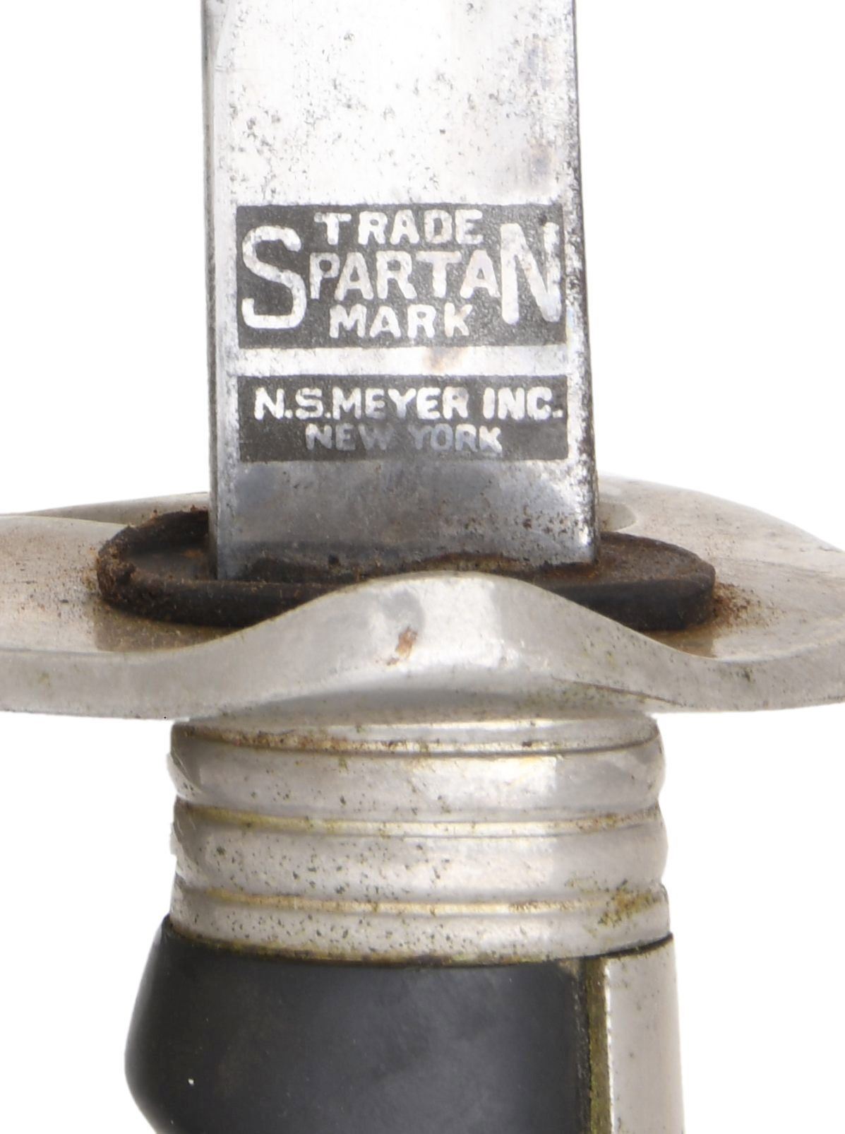 1) A nice example of an M1903 officer’s saber measuring 38" overall with a 31 3/4" single-fullered blade. Blade is etched over the first 19" with various foliate, patriotic, and military motifs, including a panel that reads "Mich. Agri. College." Three-branch guard with downturned, pendulous quillon. Plain backstrap with stepped pommel. Black enameled steel grip. Plated iron scabbard missing its throat. Scabbard is attached to a large brown leather "Sam Brown" belt with sword strap and over-the-shoulder strap. CONDITION: blade has an overall light gray patina with some spotted discoloration. Hilt is a bit misshaped, and grip paint is approx. 75%. Scabbard shows some losses of finish. Belt is quite pliable and has a pleasing finish. 2) A very nice example of an M1903 officer’s saber measuring 36 3/4" overall with a 29 3/4" single-fullered blade. Blade is etched over the first 18" with various foliate, patriotic, and military motifs, including a panel on one side that reads "CULVER" and a larger panel on the other side that is blank for the owner’s name." Three-branch guard with downturned, pendulous quillon. Plain backstrap with a one-step pommel cap. Black composite grip. Plated iron scabbard missing its throat. Scabbard is attached to a large brown leather "Sam Brown" belt with sword hanger and over-the-shoulder strap. CONDITION: blade shows traces of original factory polish. Hilt generally shows light wear, as does the scabbard. (02-22918-3/BF). $400-600.