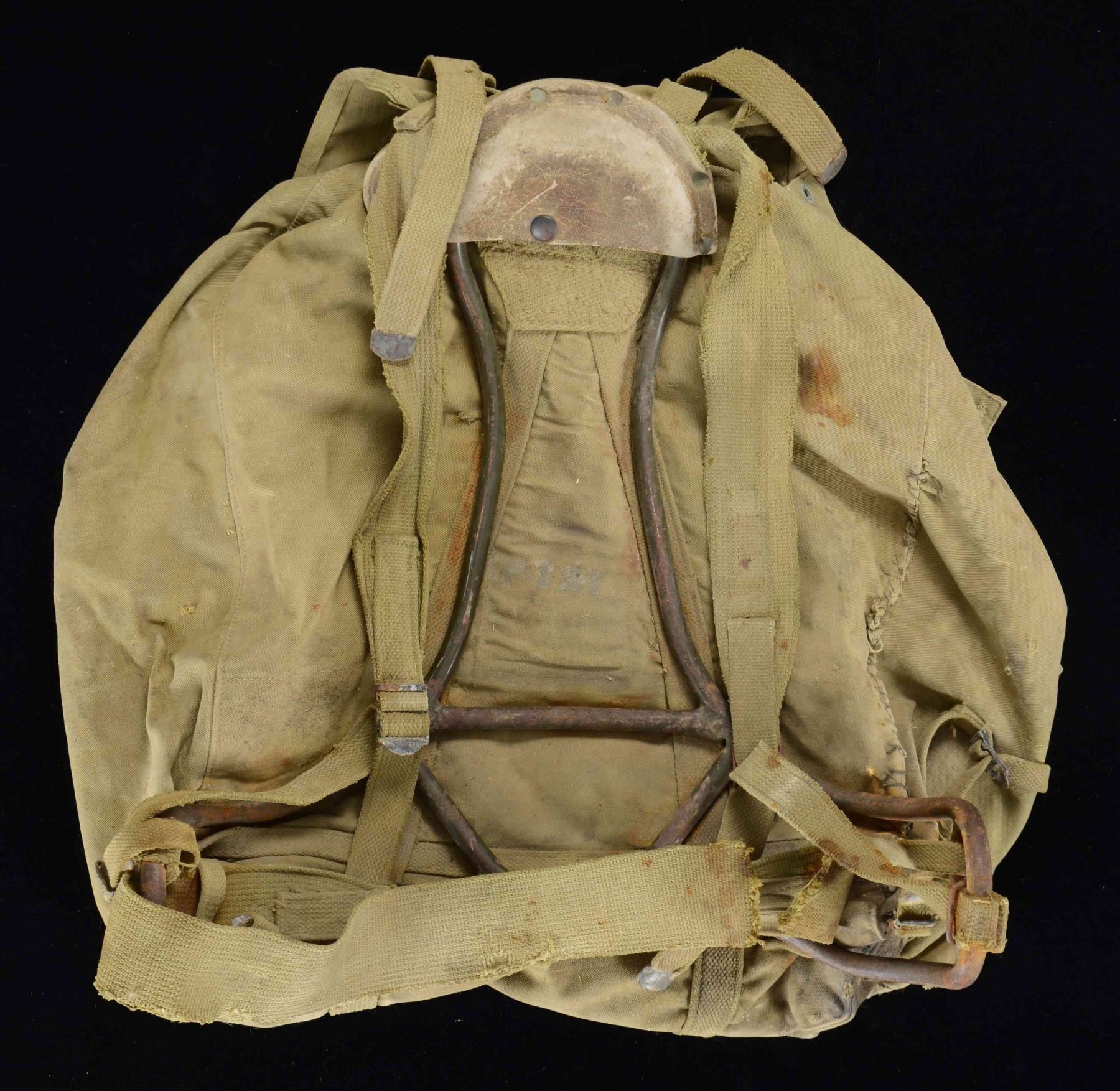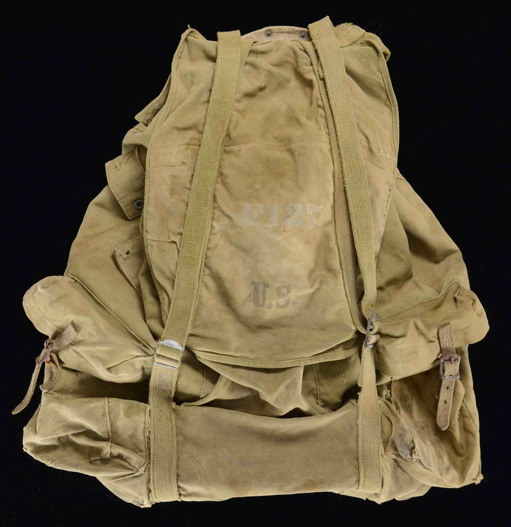 A well-worn and well-used example of a WWII US GI backpack with a heavy-formed iron frame. The outside top flap is stenciled "F127" in white above "U.S." in black. CONDITION: iron frame shows oxidation. Many suspension straps are stained and frayed. A few seams are open or have seen field repairs. This backpack saw extensive service during the war and is likely a veteran of many major conflicts. (02-22440-1/BF). $100-200.