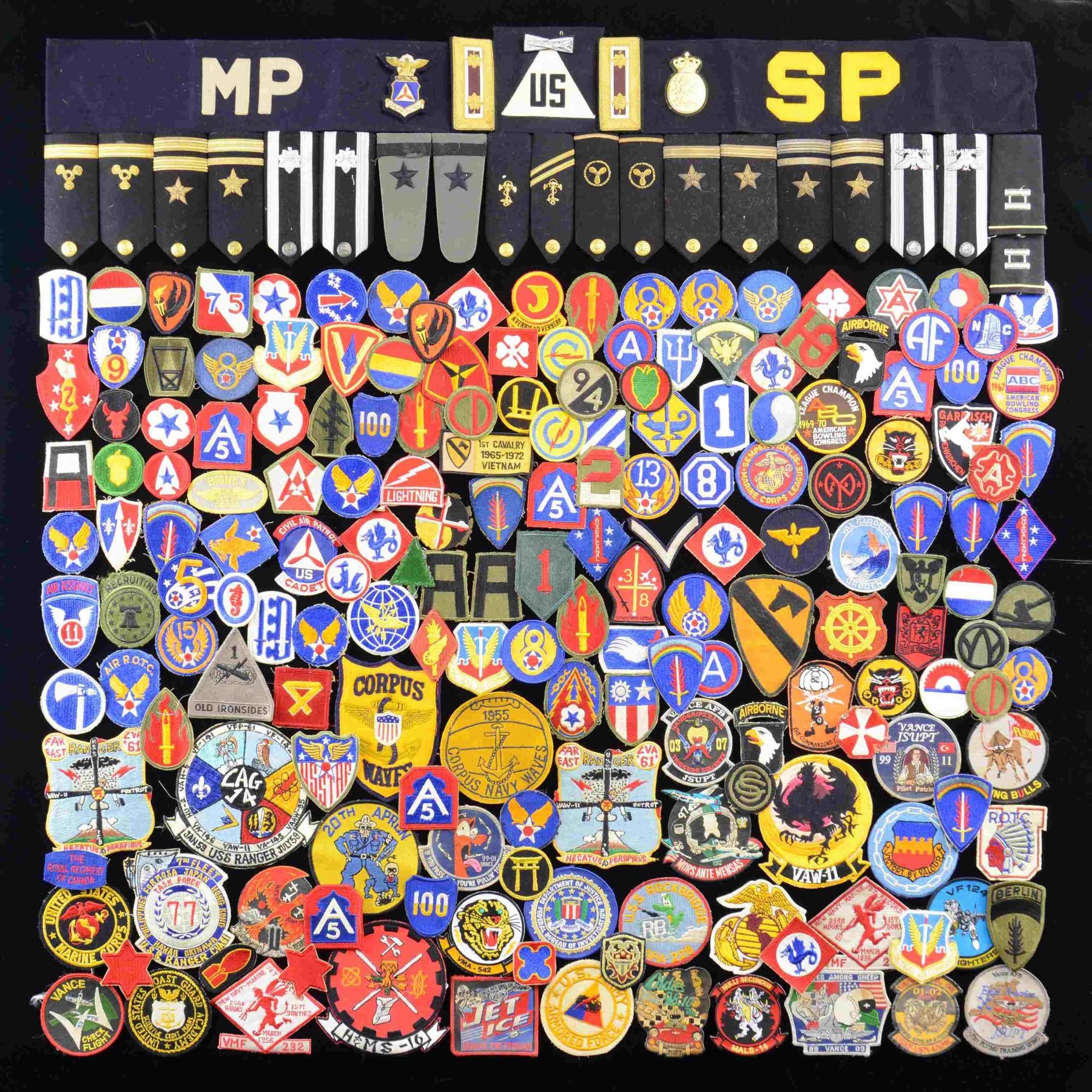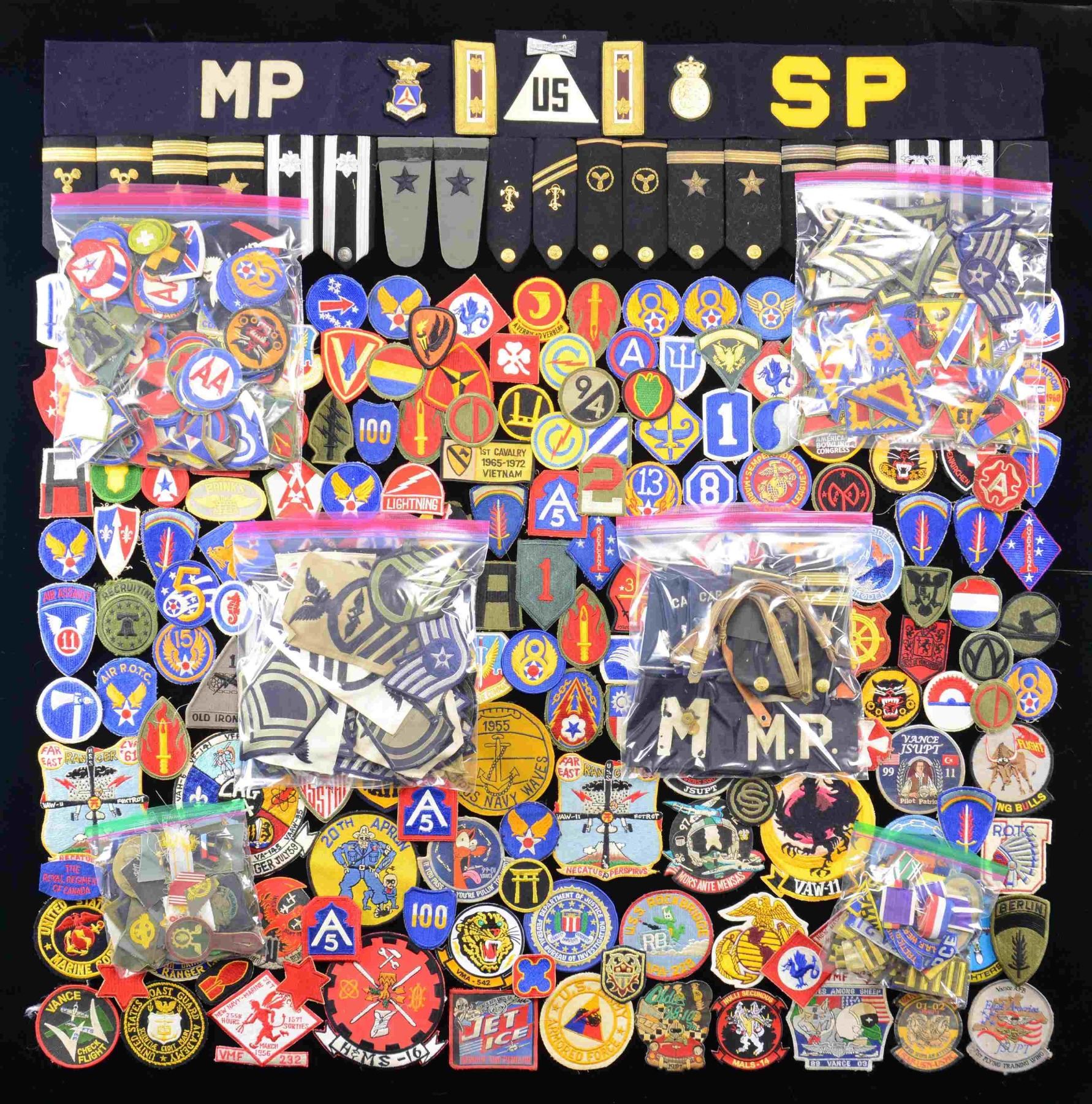 SHOULDER BOARDS & OTHER INSIGNIA. This lot includes well over 500 US military patches from the WWI era through Desert Storm. Most appear to be divisional or unit patches, but there are rank patches also. Also included are 3 MP armbands. / 1 SP armband. / 1 Correspondence patch. / 1 Pair of Army Major’s shoulder straps in gold bullion. / 6 Civil Air Patrol Lieutenant Colonel’s shoulder straps. / 1 Pair of Air Force Lieutenant Colonel shoulder straps. / 1 Pair of Air Force Colonel’s shoulder straps. / 1 Pair of Naval green shoulder straps for a Lieutenant. / 1 Pair of Merchant Marine Engineman shoulder straps. / 2 Pairs of Navy LTJG shoulder straps. / 2 Pairs of Navy Ensign shoulder straps. / 1 Pair of Navy Lieutenant shoulder straps. / 1 Pair of Merchant Marine Engineman Cadet shoulder straps. / 2 Single Naval Academy shoulder straps. / 1 Pair of Army slip-on Captain’s shoulder straps. / 3 Officer chinstraps. / 1 Civil Air Patrol blazer patch. / 1 Dutch cap badge. / 1 Air Force bullion Missel Tech Badge. / 4 Small military pins or insignia. CONDITION: all items generally show light wear. (02-22954/BF). $500-750.