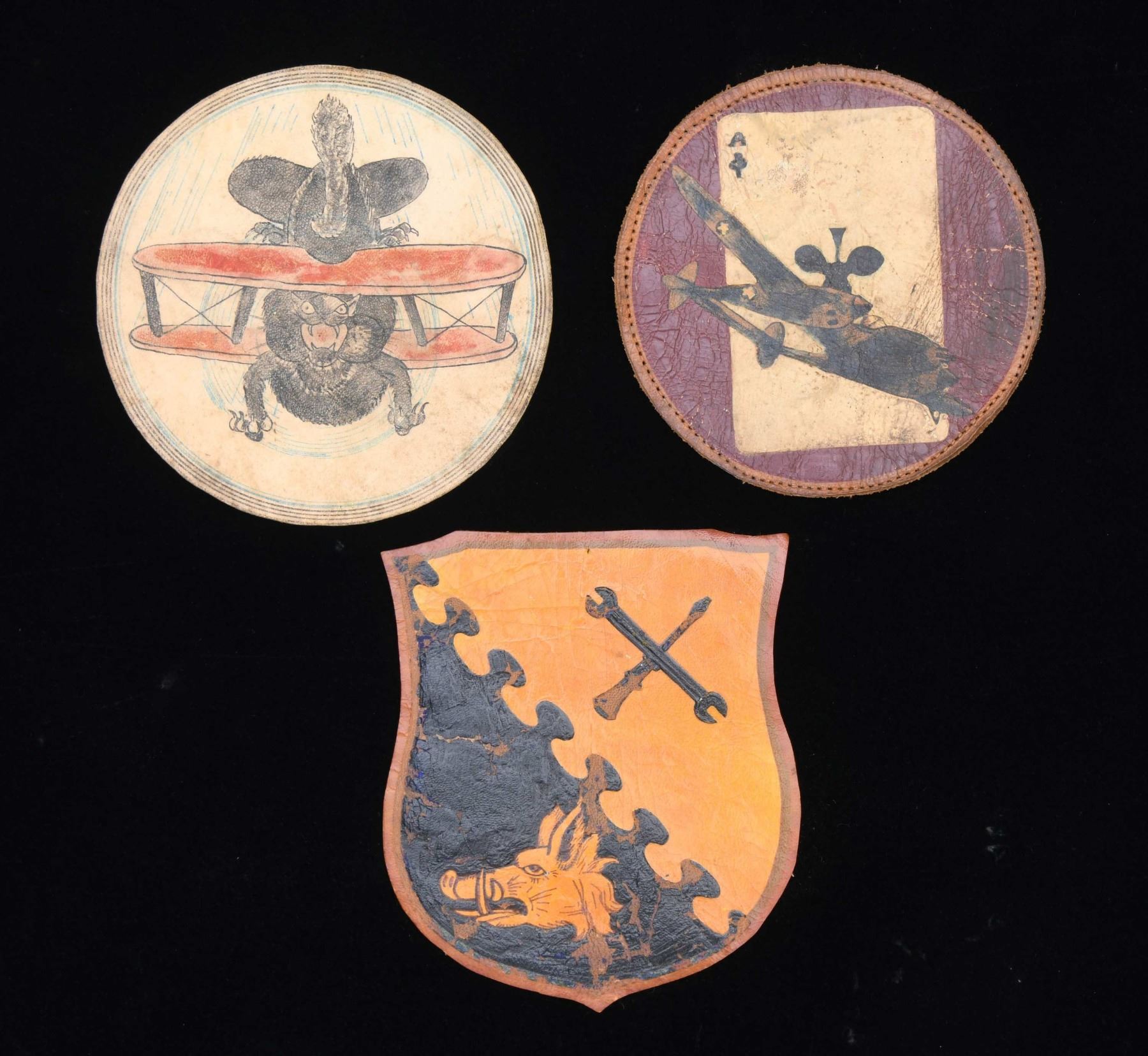 1) This first example is 4 1/2" in diameter and depicts a black cat fitted with biplane wings and a tail section. There are concentric black and blue lines on the outside and black and blue lines on the interior to show shading. The back of the patch has an ink inscription that appears to read "Gift of: Capt. C.B. Gaithauer Summer '42." CONDITION: patch shows light fading with no damage. 2) This example is 4 1/4" in diameter and depicts an ace of clubs on a maroon field with an American P38 Lightning diving diagonally across the card. The ace of clubs is done in black and white paint, with the field of the patch being a dark maroon. CONDITION: patch does show a little flexing and soiling but remains quite sharp and vivid. 3) Lastly, a shield-shaped patch measuring approx. 4 3/4" x 4". The patch is divided in half diagonally with an oddly crenelated line. The orange top of the patch has a crossed screwdriver and wrench in black, and the bottom black half of the patch has an orange boar’s head. CONDITION: patch remains vivid, but there is some flexing and a bit of paint loss, particularly in the black half. (02-23087/BF). $500-750.