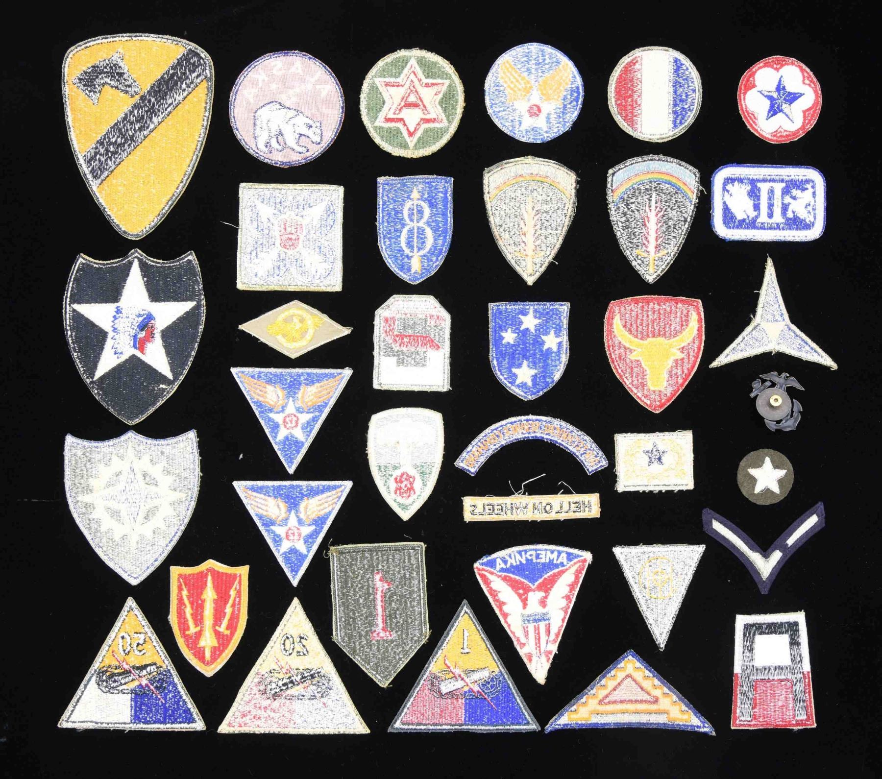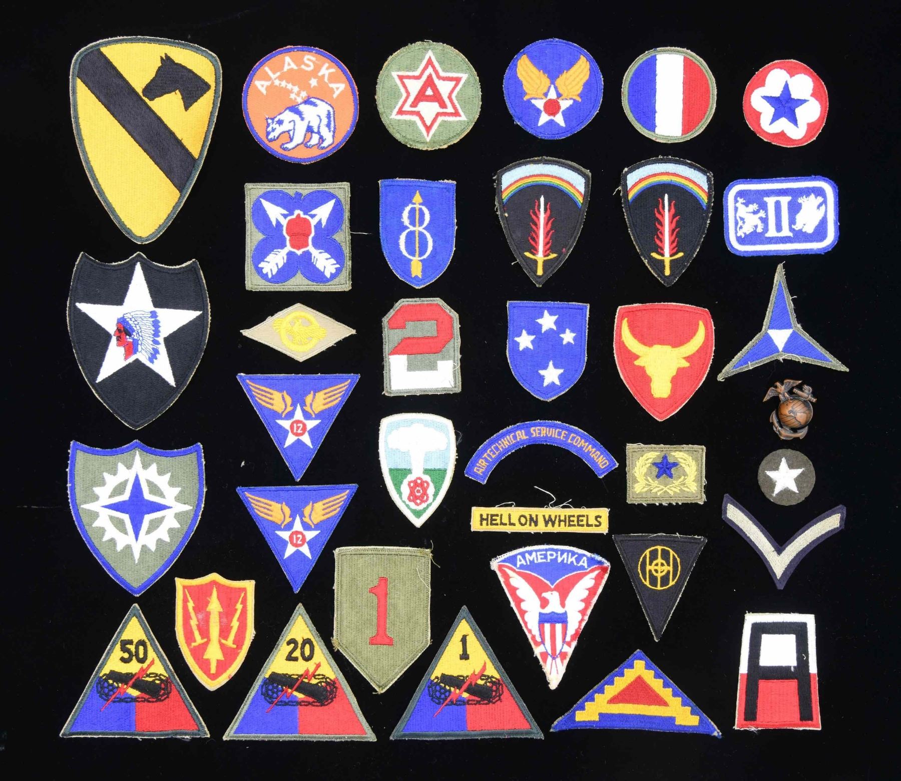 This lot consists of approx. 33 US military patches, mostly of the WWII period. There is a good variety of patches, the vast majority of which are unit and divisional patches. Included in this lot is a scarce WWII Alaska Defense Command Patch. Please see photographs for exact patches in this group. The Marine EGA is a subdued example with a screwback. The globe has horizontal lines only. CONDITION: all items generally show light wear. (02-23090/BF). $100-200.