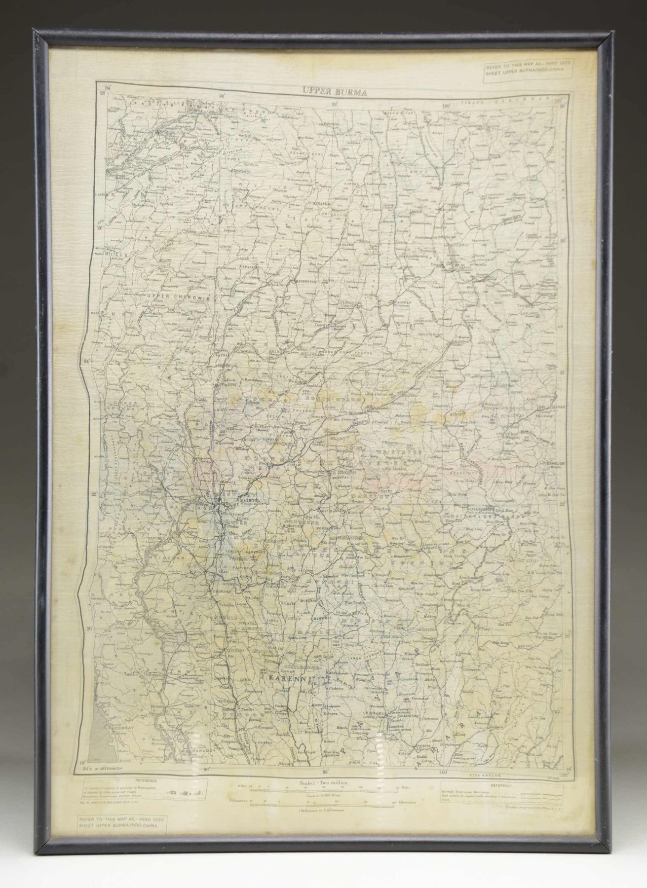 INDO-CHINA. This framed silk map measures approx. 19" x 27" and is titled "UPPER BURMA" on one side with "INDO-CHINA" on the other side. The scale of both maps is 1" to 31.566 miles, and the reference keys denote railways, roads, capitals, provinces, and more. Both maps are marked in the upper right and lower left-hand corner "REFER TO THIS MAP AS. - HIND 1055 SHEET UPPER BURMA/INDO-CHINA." The map is framed between two pieces of glass so both sides may be viewed simultaneously. CONDITION: map shows light wear with only the slightest staining. (02-22974/BF). $150-300.
