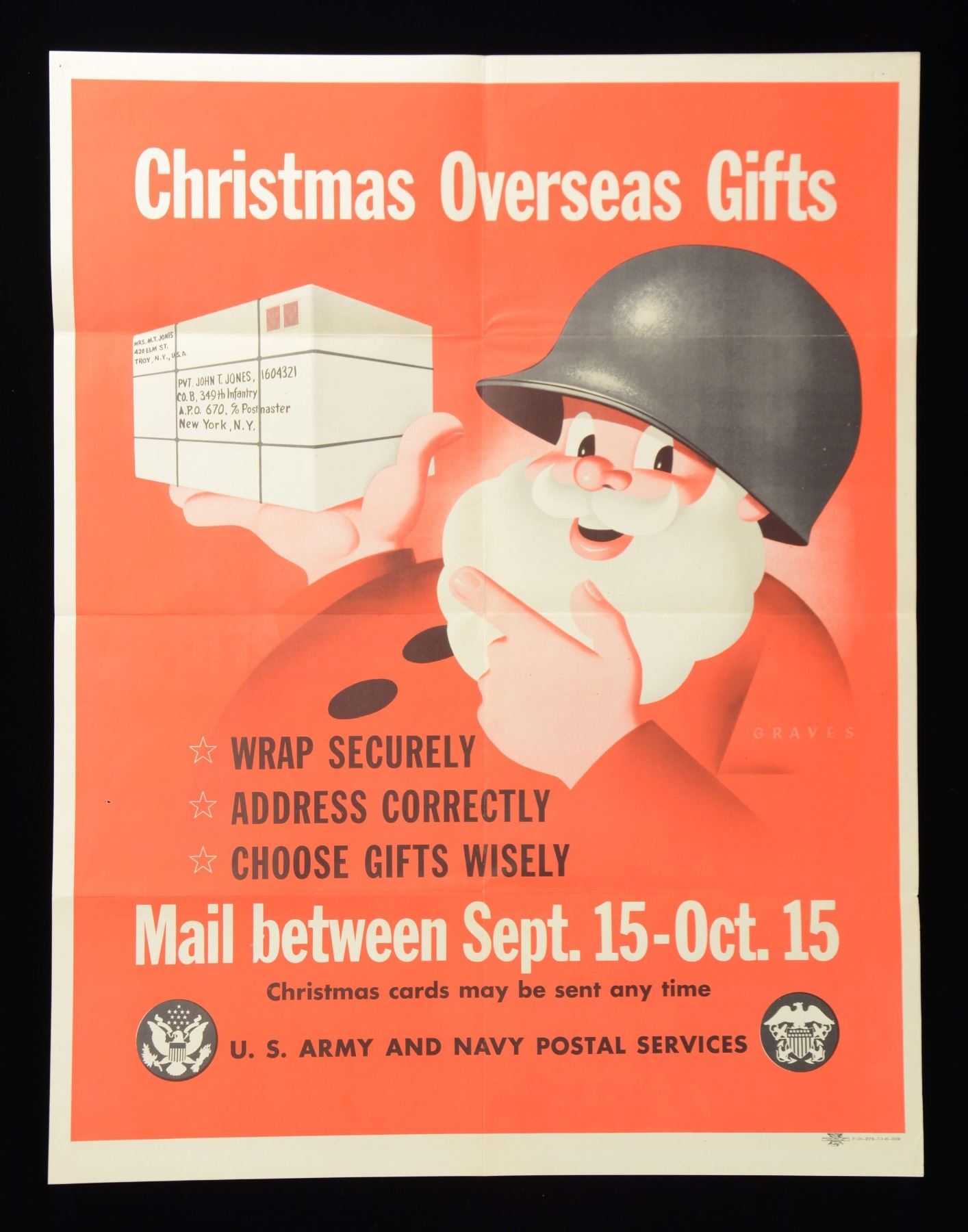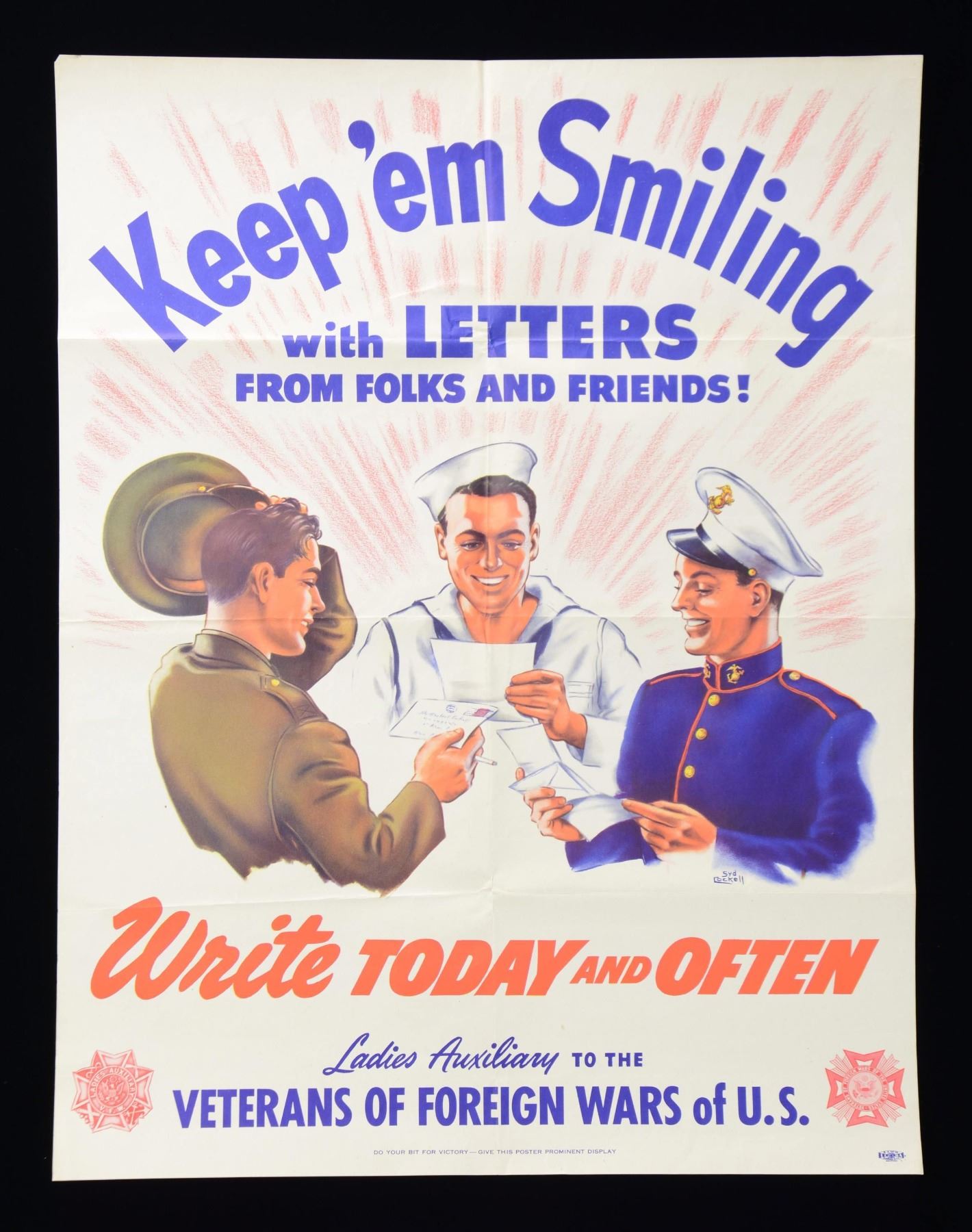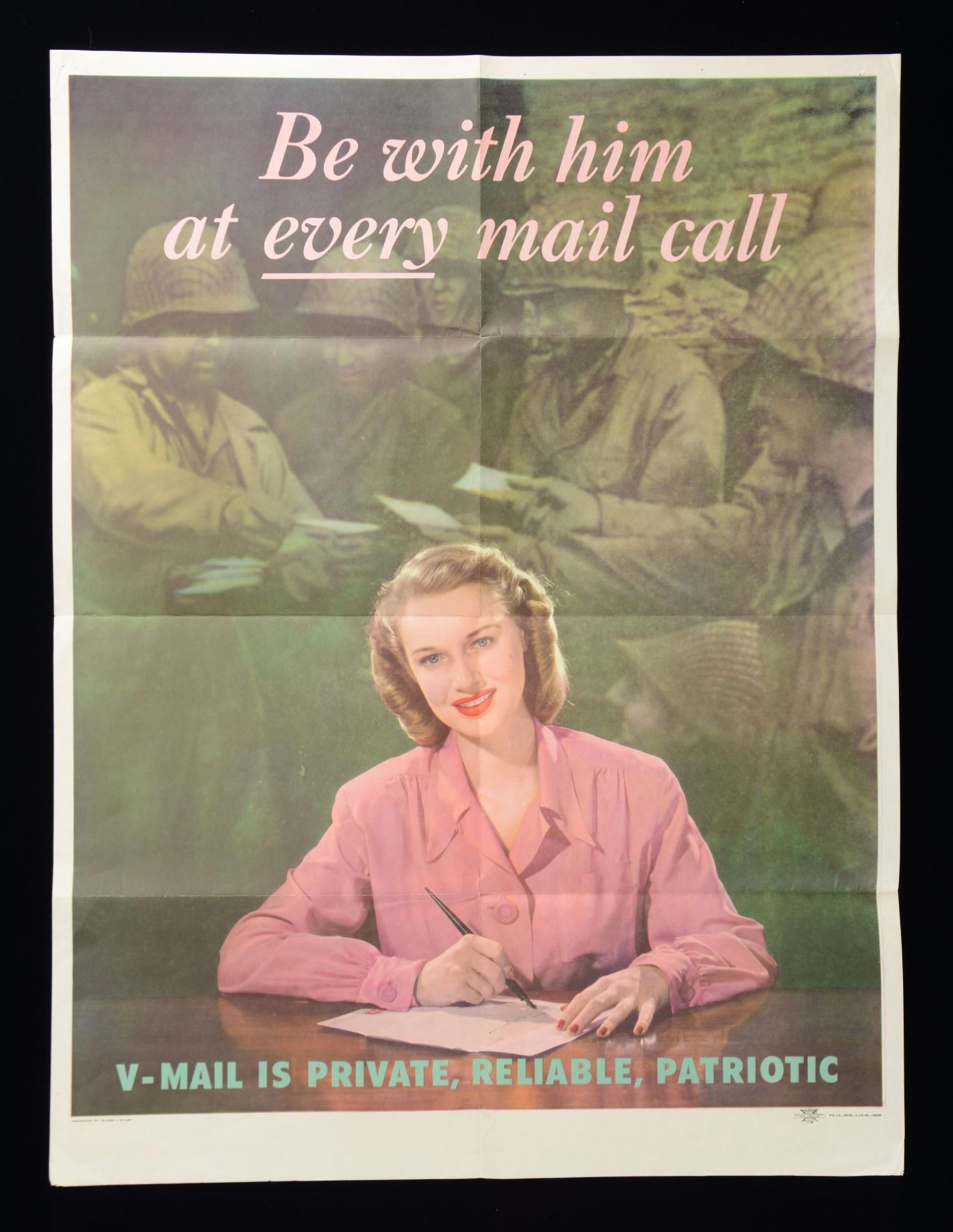 These folding posters were for war bond funding. Posters include: Christmas Overseas Gifts. Buy War Bonds Over Time" War bond chart. "Be with him at every mail call" promoting V-Mail. "Keep 'em Smiling". CONDITION: posters overall in good condition showing holes, tears & tack holes. (02-23315/MD). $100-200.