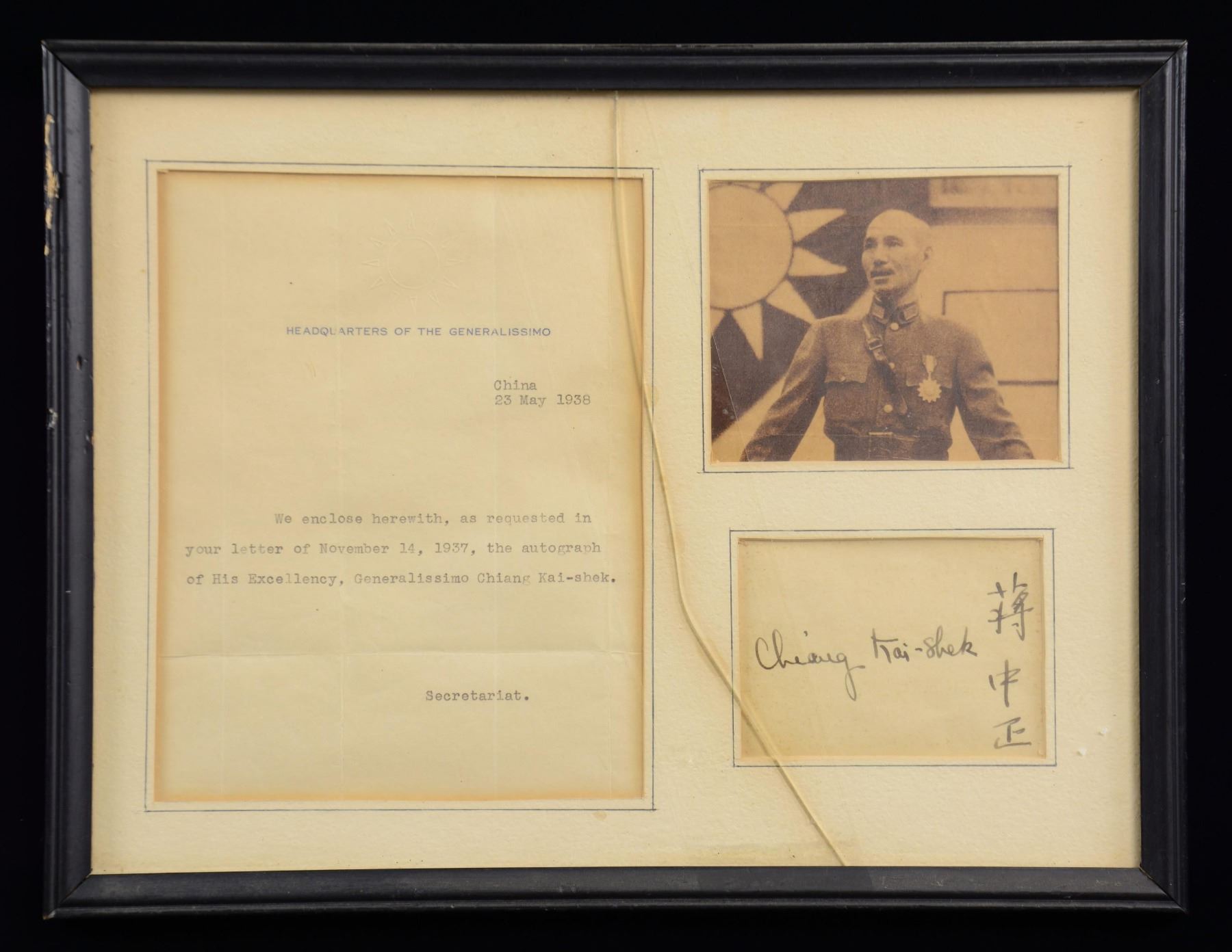 This 12 3/4" x 9 3/4" frame contains a signature of Nationalist Chinese Generalissimo Chiang Kai-shek. The frame also includes a photograph of him in uniform in front of a Nationalist Chinese flag. There is also a letter with a preprinted heading that reads "HEADQUARTERS OF GENERALISSIMO". The body of the letter reads, "China 23 May 1938 We enclose herewith, as requested in your letter of November 14, 1937, the autograph of His Excellency, Generalissimo Chiang Kai-shek. Secretariat." CONDITION: the letter is clear but has slightly yellowed; the photograph is also a bit yellowed. The signature is bold and easily read, both in Chinese and Anglo letters. The frame has cracked glass. (02-23294-1/BF). $500-750.