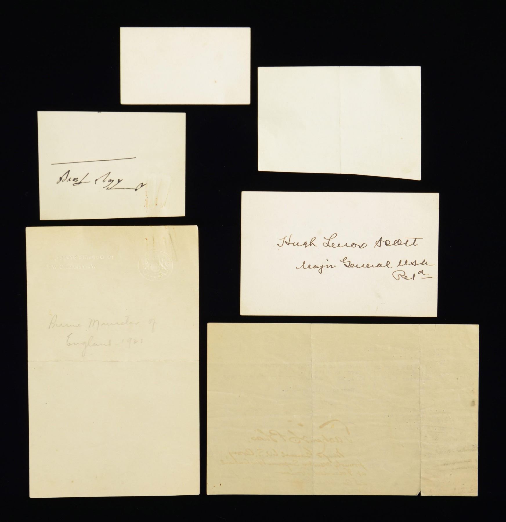 FIGURES. 1) A 4 1/2" x 3" piece of paper with the original signature of John J Pershing. Pershing was a world-famous military figure and leader of the American forces in Europe during WWI. "Black Jack" Pershing was one of the few Americans to ever hold the rank of "General of the Army". 2) A 3 1/2" x 2" card with the original signature of Lieutenant General Nelson A. Miles. Miles held the title of "Commanding General of the United States Army" toward the end of his career. He fought bravely through the Civil War, earning the Congressional Medal of Honor for gallantry at the Battle of Chancellorsville. He fought in many Indian War campaigns and led the Army during the Spanish American War. 3) A 3 3/8" x 5 3/8" card with the signature of Major General Hugh Lenox Scott. Scott served with distinction on the Western Frontier after graduating from West Point in 1876. Most of his service was with the 7th Cavalry, and he was charged with marking the grave sights of General Custer’s men that were killed at the Little Big Horn. 4) A 4" x nearly 3" piece of paper signed by David Lloyd George, the Prime Minister of England. The paper is accompanied by a small piece of 7" x 5" stationary with the impressed heading "10. DOWNING STREET. WHITEHALL, S.W.1." The stationery is dated "29th July 1921". 5) A 7 1/2" x 5" piece of paper signed by Major General Tasker H. Bliss. Bliss served in many capacities during the Indian War period through WWI. He is most remembered as a member of the Supreme War Council at Versailles and American Plenipotentiary at the Paris Peace Conference of 1918-19. CONDITION: all items generally show light wear. All signatures are clear and easily read. Most of the paper has slightly yellowed. (02-23298-7/BF). $400-700.
