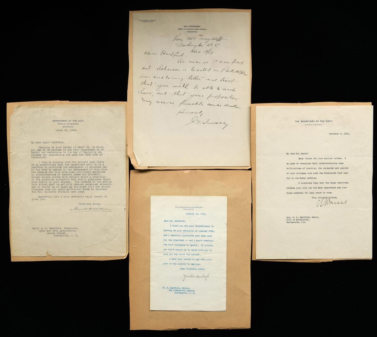 DEPARTMENT AND THE TREASURY DEPARTMENT. These 14 letters vary in size from approximately 5" x 7" to 10 1/2" x 8". The printed headings at the top read "THE ASSISTANT SECRETARY OF THE NAVY WASHINGTON", "DEPARTMENT OF THE NAVY WASHINGTON", "THE SECRETARY OF THE NAVY WASHINGTON", "NAVY DEPARTMENT", TREASURY DEPARTMENT", and "THE SECRETARY OF THE TREASURY". The letters are dated from 1905 to 1931, and most appear to have been written to F.W. Hartford of Portsmouth, New Hampshire. The letters address a variety of subjects, but many seem to be related, in some way, to the operation of the Navy yard at Portsmouth. Autographs include Winthrop, MacVeagh, Bailey, Harks, Woodbury, Jahncke, Wilbur, and several more. Most notable among the signatures is that of Theodore Roosevelt Jr. CONDITION: the letters are partially glued to backing papers at the very top of the sheets and show very light wear with nearly no discoloration. The typed sections are very clear, and the signatures remain strong. (02-21850-6/BF). $200-300.