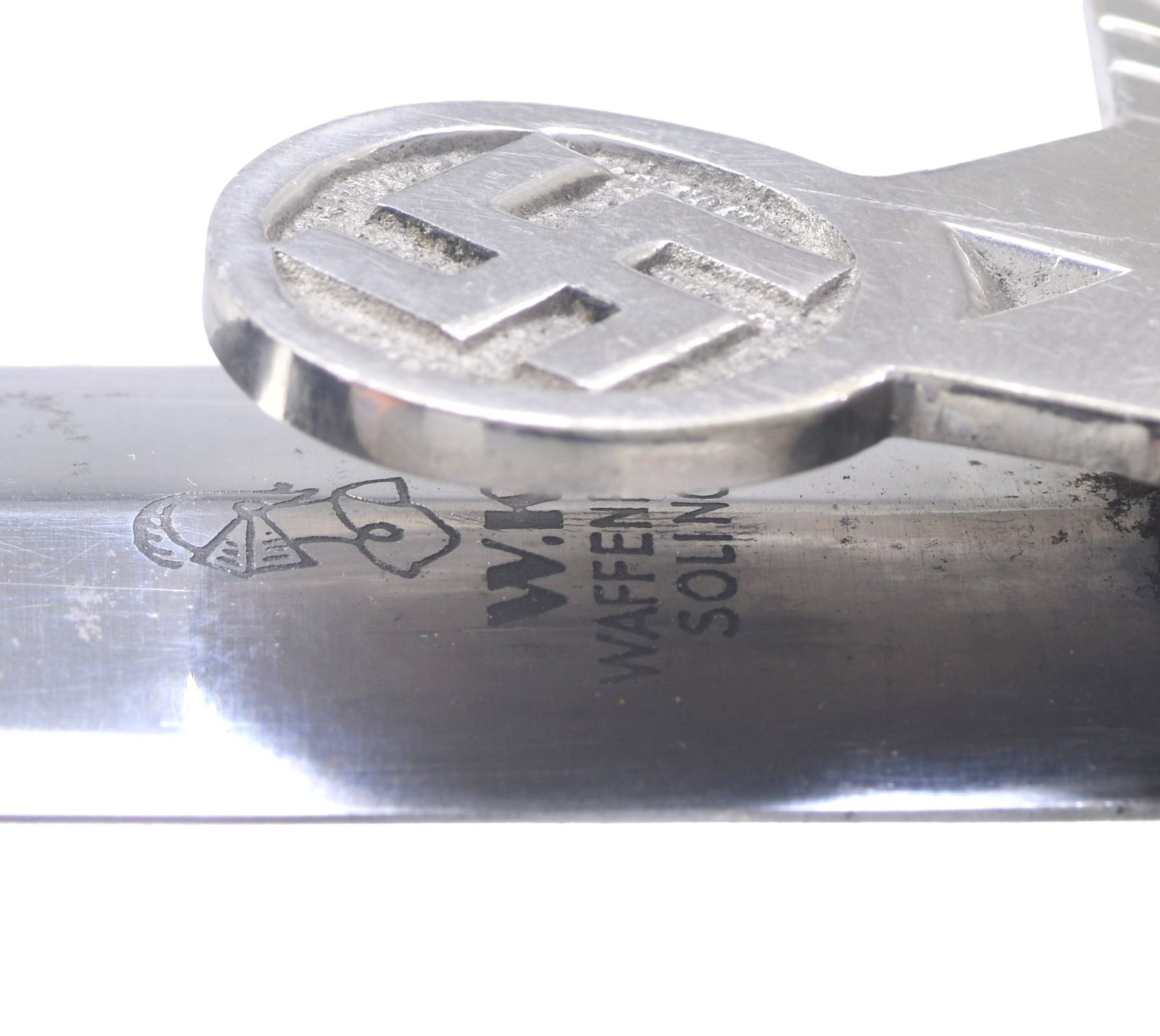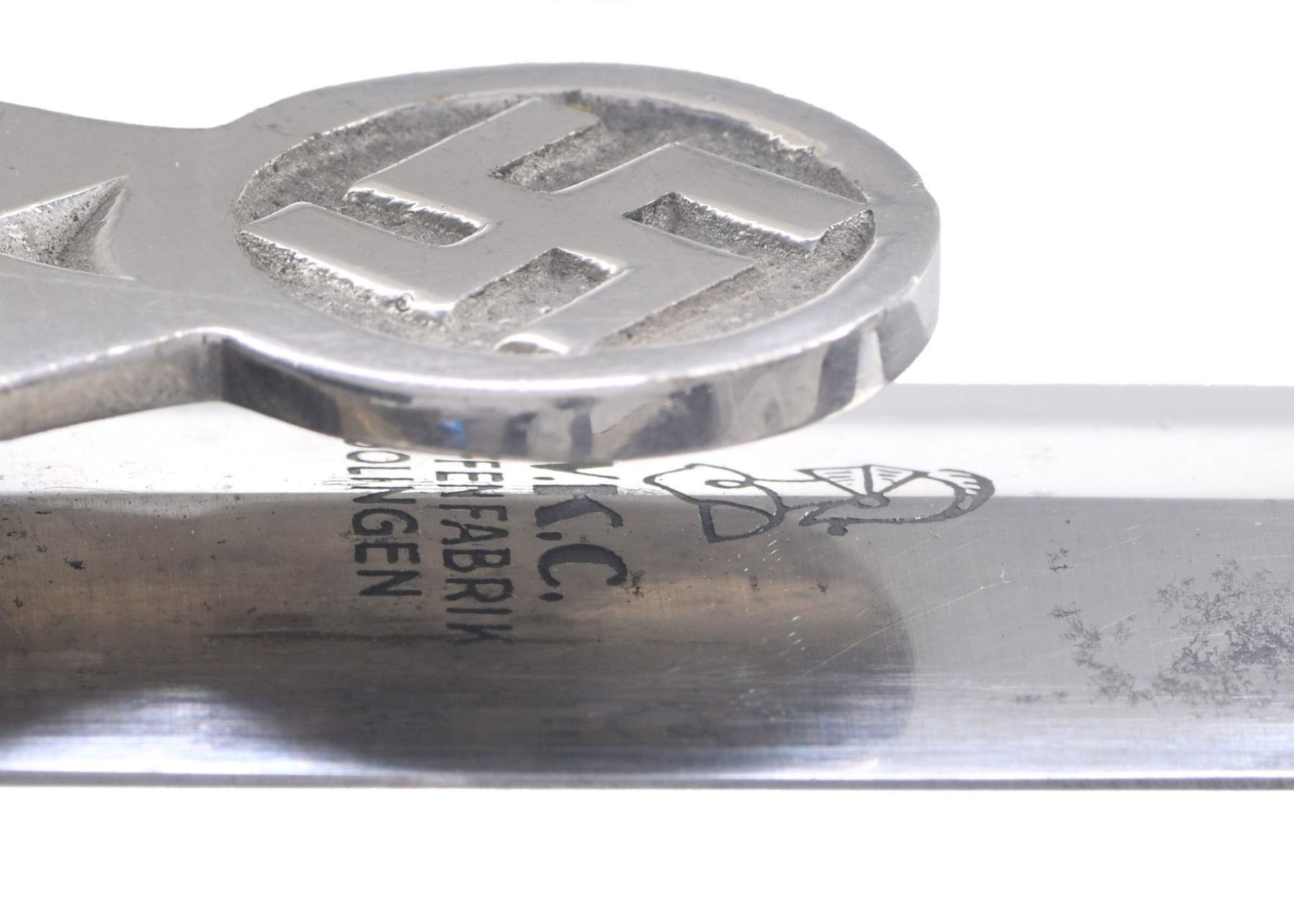 This scarce German dagger has an overall length of 14 1/2". It has a plain blade marked near the hilt "(knight’s head) W.K.C. WAFFENFABRIK SOLINGEN". Stylized plated eagle guard with party symbol below. Plated pommel. Wooden grip with a central silvered starburst featuring a black-enameled party symbol in the center. Scabbard has a black enamel finish with a plated throat and tip. Only the attachment clip for the dagger hanger remains. CONDITION: blade shows areas of original factory polish with some very minor oxidation near the hilt. Hilt shows light wear overall. Scabbard has minor losses to the black-enameled finish. (02-22927-1/BF). $800-1,200.
