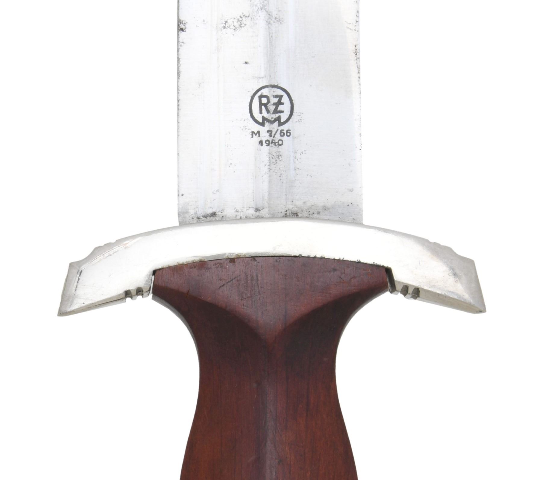 KNIFE. 1) SA. Overall length: 15". Blade is etched "Alles fur Deutschland" and is marked near the hilt "RZM M 7/83". Plated crossguard and pommel guard. Wooden grip with aluminum eagle and brown enamel "SA" button. Brown enamel scabbard with plated mounts. The dagger has its original hanger marked "RZM M5/8". CONDITION: blade shows substantial original factory polish. Hilt shows light wear but has a crack in the center of the pommel guard. Scabbard also shows light wear. 2) NSKK. Overall length: 14 3/4". Blade is etched "Alles fur Deutschland" and is marked near the hilt "RZM M 7/66 1940". Plated crossguard and pommel guard. Wooden grip with nickel silver eagle and brown enamel "SA" button. Black enamel scabbard with plated mounts. CONDITION: blade shows substantial original factory polish. Hilt shows light wear with some oxidation between the grip and the guards. Scabbard shows light overall wear. 3) HJ. Overall length: 9 7/8". Blade has the remains of etching that reads "Blut und Ehre". The reverse of the blade is marked "ANTON WINGEN JR (knight) SOLINGEN". Plated guard and bird effigy pommel. Two-piece composite grips. Black enamel iron sheath with integral black leather hanger. CONDITION: blade shows notable oxidation and wear. Hilt has lost 30% of its plating. Front grip is missing the diamond and is cracked in half. Sheath shows moderate wear with less than 50% finish. Snap cover is missing. (02-22927-2/BF). $700-900.