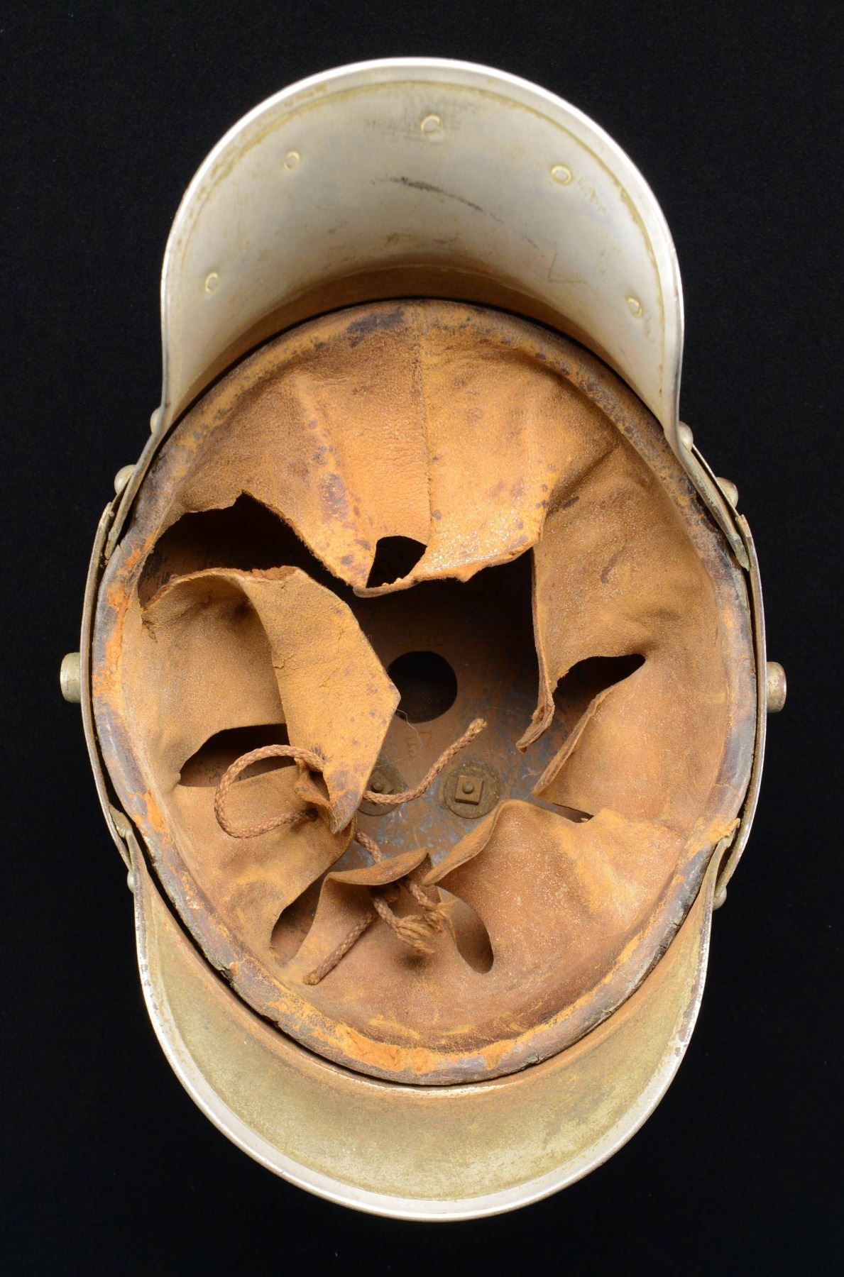 This is quite a rare example of a true Saxon M1915 Guard Reiter, all steel, lobstertail helmet. Helmet has a plated steel body with a 4-rivet, elliptical spike base. The upper part of the spike is missing. There is a raised ridge behind the spike base, indicating this is a true Saxon Guard Reiter helmet. The steel front plate displays the classic Saxon crowned crest in a starburst design. There are no kokarden, and there is no chinstrap. The interior shows an enlisted type brown leather, tongued liner. CONDITION: the helmet body is quite solid and shows some areas of darker oxidation. The front plate is complete and undamaged. As stated, the top of the spike, kokarden, and chinstrap are missing. The liner shows wear with a few losses and some tears. As can be seen in the photographs, this helmet presents very well and, with a little restoration, could be the centerpiece of a collection. (02-23070-1/BF). $1,200-1,800.
