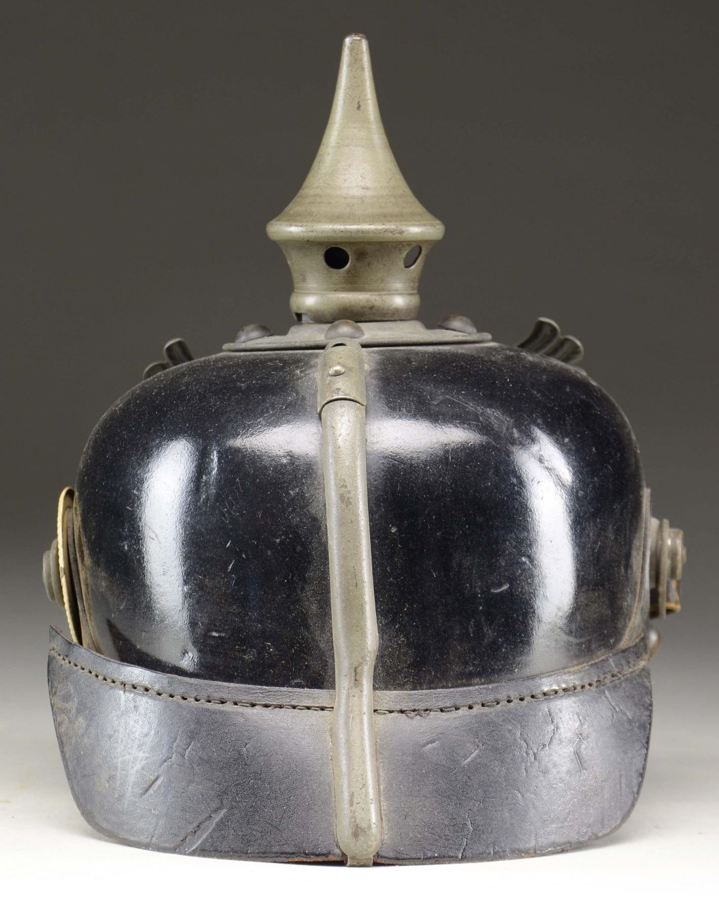 This fine helmet has the expected black leather body with gray metal trim that includes the spike, base, rear spine, front visor trim, plate, and side posts. The front plate is of standard Baden-type with a ribbon below that reads "MIT GOTT F. FUERST U. VATERLAND". The helmet is complete with a chinstrap that shows the correct fittings. The left side of the helmet has a single incorrect Saxon kokard. CONDITION: the helmet body is generally quite solid. The rear visor is complete but partially detached. There are no extra holes behind the front plate. The liner is all but disintegrated. (02-23070-2/BF). $600-900.