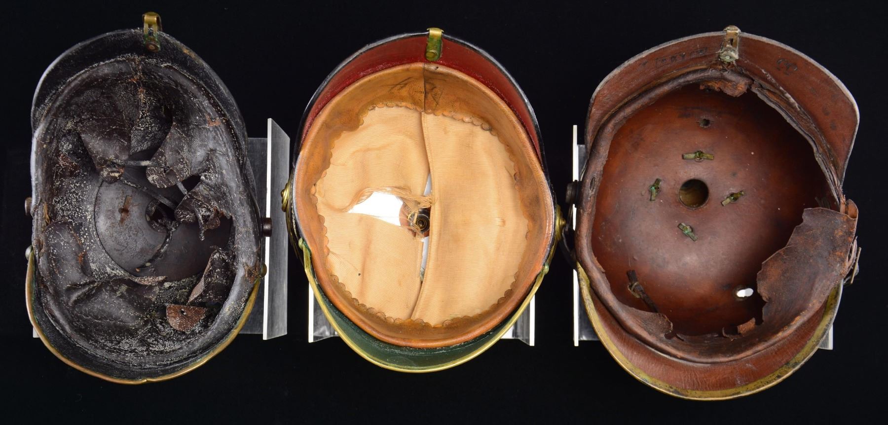 1) BAVARIAN. A splendid Bavarian officer’s spike helmet with gilded brass front plate, chin scales, fluted spike, quatrefoil spike base, rear spine, and front visor trim. The correct national and Bavarian officer’s kokarden are on either side of the helmet. The front visor has a green backing, and the rear visor has a red backing. Fine, light brown leather sweatband with 2-piece silk tan liner. CONDITION: body of the helmet is quite solid with a few minor scrapes. Interior is complete. One half of the silk liner is separated. 2) PRUSSIAN. A Prussian enlisted man’s infantry helmet with gilded brass front plate, spike, spike base, rear spine, and front visor trim. The chinstrap studs on either side are iron. The leather chinstrap has brass buckles and brass attachments on the end. The right side of the helmet has an enlisted national kokard, and the right kokard is missing. The interior rear visor is stamped "55" and "R. J. A. X1. w." in a rectangle. Both visors have a brown leather reverse. Partial leather liner. CONDITION: helmet body is solid but has a few scuffs and scrapes. Brass has a rich patina with traces of gilding remaining. Chinstrap is original, as is the single kokard. Liner is 10% complete. 3) GERMAN. A German brass-trimmed enlisted spike helmet with no front plate. The spike, spike base, rear spine, and front visor trim are all brass. The side posts are iron, and there is no chinstrap. Partial liner. CONDITION: this helmet should be considered in relic condition and primarily valued for parts. Leather liner has losses and appears to have been heavily oiled. Both the interior and the exterior show white mold. Brass has a dark patina, and the front of the helmet has extra holes for mounting various plates. (02-22734-6/BF). $1,500-2,000.