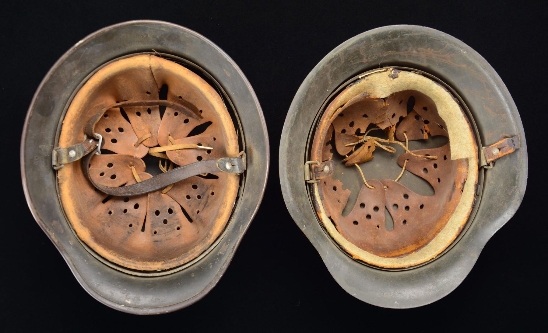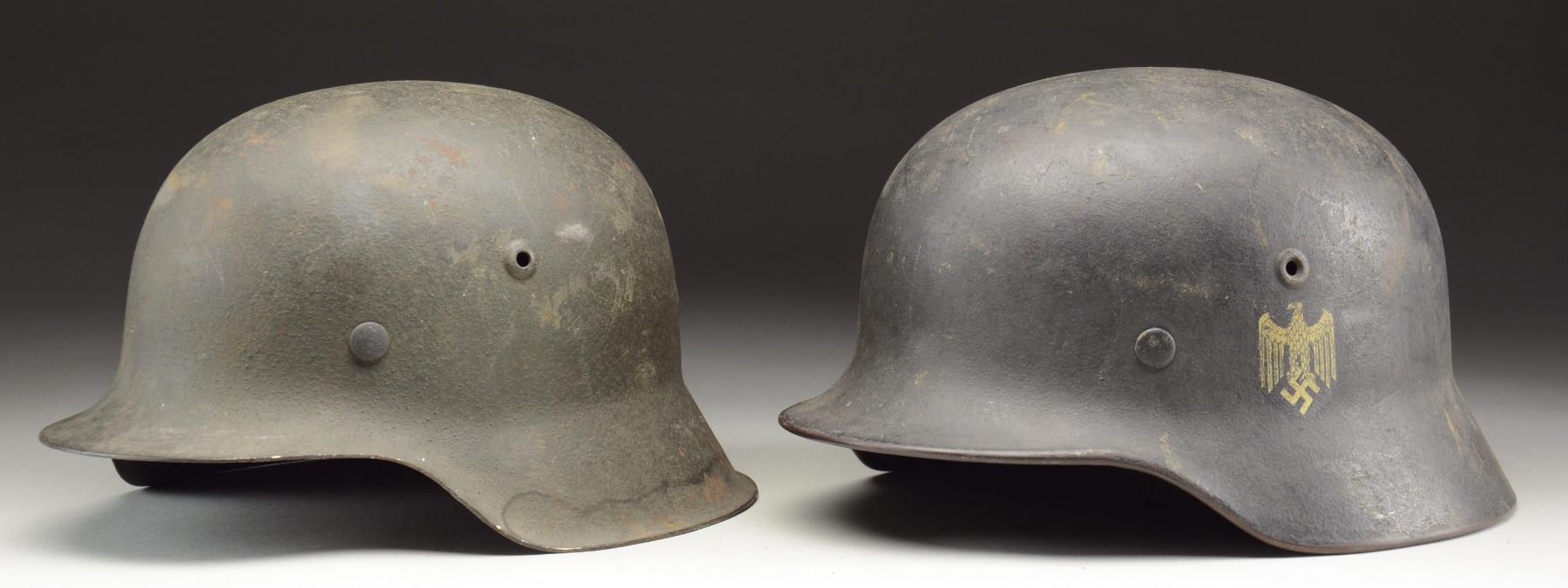 1) WEHRMACHT. An excellent example of an M1940 Wehrmacht single decal helmet. Helmet has a gray/green painted finish with a single Wehrmacht eagle decal on the left side. The inside rear of the helmet is stamped "141", and the inside left is stamped "Q66". Full brown leather liner and brown chinstrap. CONDITION: helmet finish is better than 90%, and the decal is also better than 90%. The liner shows wear but is complete and undamaged, as is the chinstrap. 2) WEHRMACHT. A good example of an M1942 Army battle helmet with a gray/green painted finish and no decals. The interior rear of the helmet is stamped "3490", and the interior left is unmarked. Partial liner and chinstrap. CONDITION: helmet finish is approx. 85%. Liner is dry and shows significant wear with some losses. Chinstrap is about 20% intact. (02-22920-3/BF). $600-800.