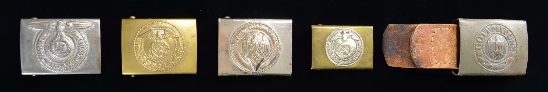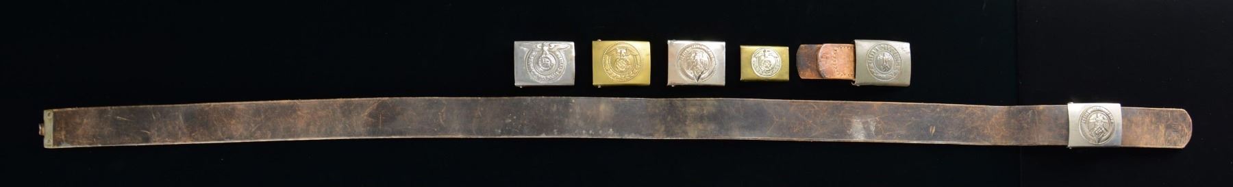 This lot includes 1 Wehrmacht belt buckle with a green-painted finish and leather tab, dated 1940. / 1 Small-size political leader’s belt buckle in brass with a silver central device. / 1 Large-size political leader’s belt buckle in brass. / 1 HJ belt buckle with a plated finish. / 1 SS belt buckle. This buckle is unmarked but appears to be original. / 1 HJ belt buckle with a plated finish and dark brown leather belt. CONDITION: all buckles are complete and undamaged. They all do show usage wear. (02-23295-3/BF). $800-1,100.