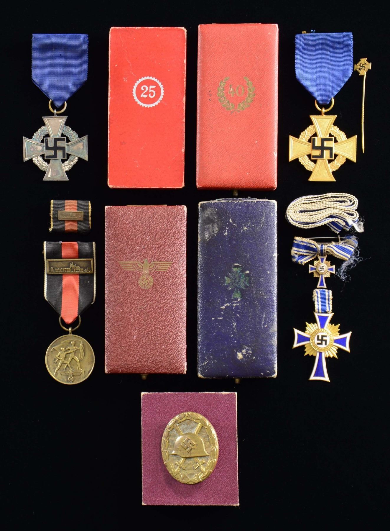 This lot includes 1 Infantry Assault Badge featuring an oak leaf wreath crossed diagonally by a Mauser rifle with a Wehrmacht eagle at the top. The reverse has a narrow pin and is marked "L 56". / 1 Enamel party pin. / 1 Political leader’s brass belt buckle. / 1 SA stickpin. / 1 WWII 2nd Class Iron Cross with ribbon. / 1 Russian Front Medal with ribbon. / 1 Gold 40-Year Faithful Service Medal with ribbon in original box. / 1 Stickpin for the 40-Year Faithful Service Medal. / 1 Silver 25-Year Faithful Service Medal with ribbon in original box. / 1 Sudetenland Medal with ribbon and Prague bar in the original issue case. Also included is a ribbon bar with a miniature Prague bar. / 1 Gold WWII Wound Badge. The reverse shows a wide pin and is marked "L 14". Badge is housed in the original maroon box of issue with a gold-embossed "LDO" on the inside. / 1 Gold Mother’s Cross with the original ribbon and miniature gold Mother’s Cross with the original ribbon, all in their original issue box. / 1 War Merit Medal with ribbon in its original issue envelope. / 1 Westwall Medal with ribbon in its original issue envelope. / 1 Flat silver bullion Army NCO breast eagle. / 1 Yellow and green Coast Artillery breast eagle. / 1 Unissued Army M43 cap eagle and cockade. / 1 Army 5th Cavalry Regiment, Brunswick Hussar’s death’s head insignia. / 1 Silver Driver’s Proficiency Badge. / 1 Gold Driver’s Proficiency Badge. / 1 Stamped General Assault Badge showing a narrow pin on the reverse. / 2 WWI 2nd Class Iron Crosses with their original ribbons. / 1 Imperial German eagle enamel stickpin. / 1 Stamped WWI cutout gold Wound Badge. / 1 Solid cast General Assault Badge with a narrow pin on the reverse, marked "f.o." / 1 NSKOV membership pin. CONDITION: items all generally show light wear, with unissued items usually showing no wear. (02-22806-6/BF). $1,200-1,500.