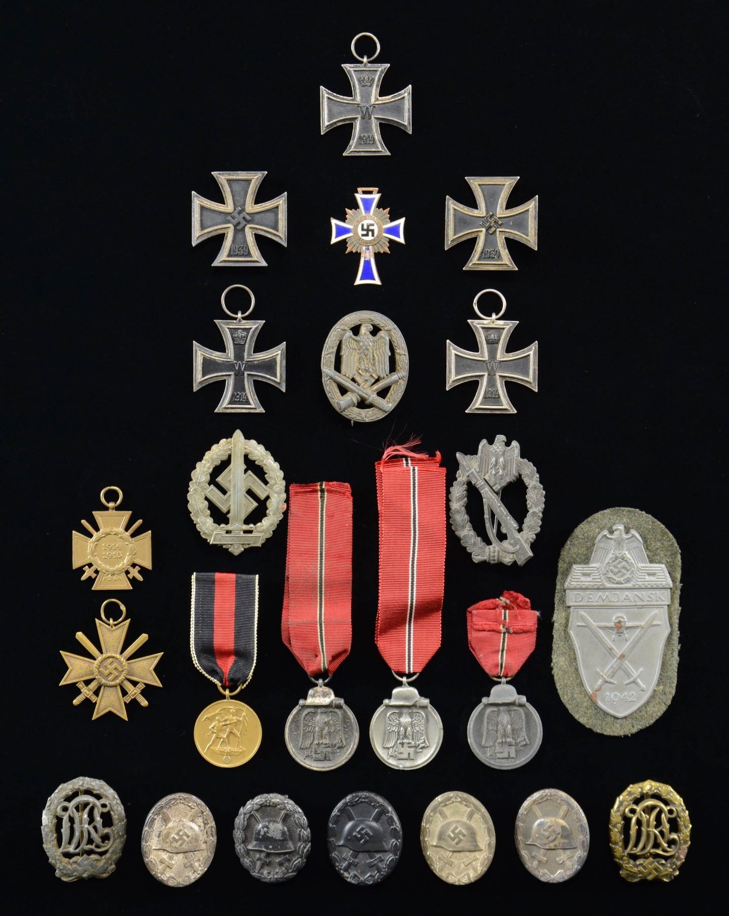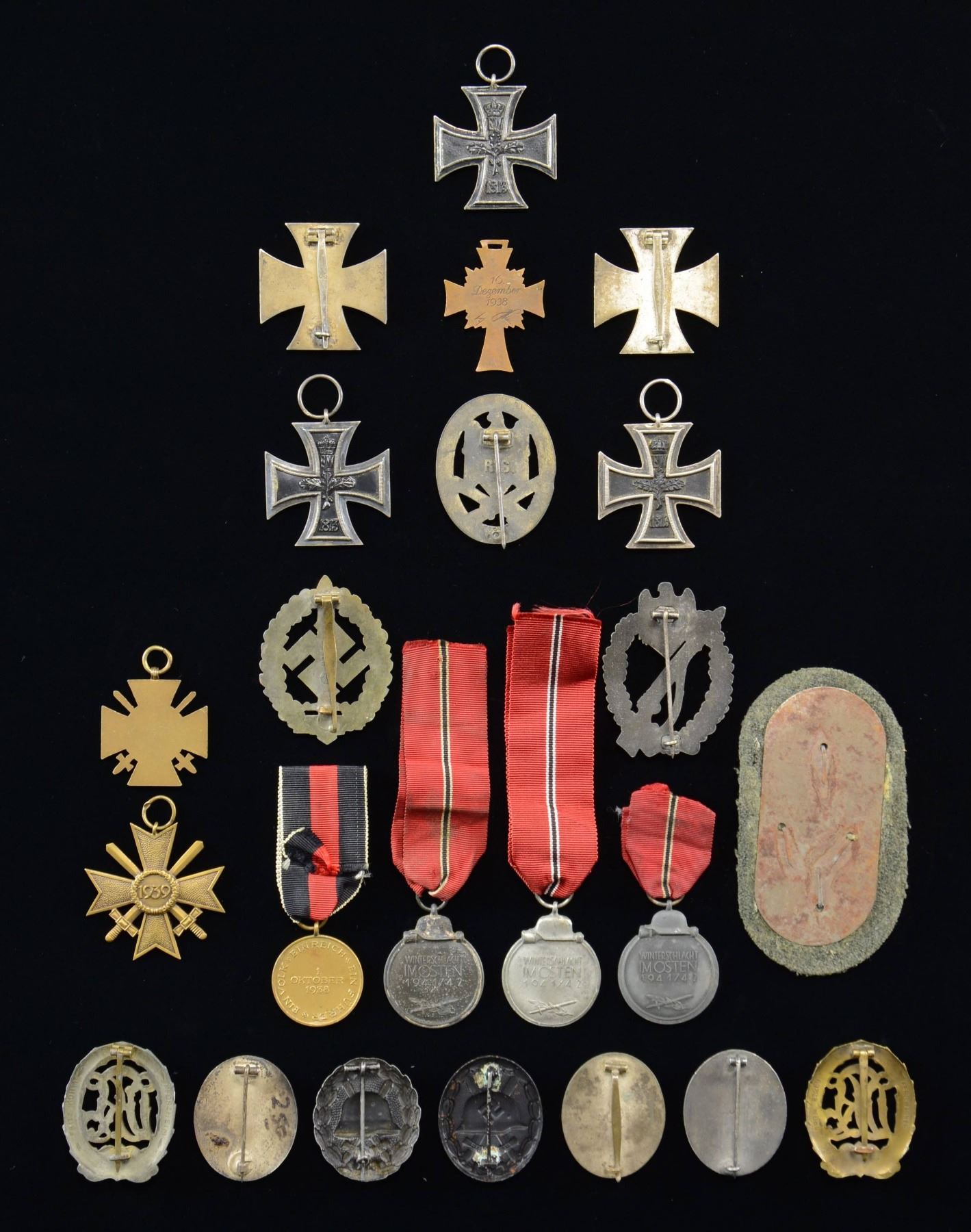 This lot consists of 3 WWI 2nd Class Iron Crosses, without ribbons, that have magnetic centers. / 1 WWII 1st Class Iron Cross with a magnetic center, and the pin is stamped "65". / 1 WWII 1st Class Iron Cross with a non-magnetic center. / 1 Bronze Mother’s Cross, with no ribbon, and enamel damage. / 1 Demjansk sleeve shield for the Army with cloth backing and a detached paper cover over the metal back. / 1 General Assault Badge, marked "R.S." on the reverse, with a missing catch. / 3 Russian Front Medals with ribbons. / 1 Sudetenland Medal with ribbon. / 1 War Merit Cross, 2nd Class, with swords but no ribbon. / 1 War Service Cross, 1914-1918, with swords but no ribbon. / 1 WWI Black Wound Badge. / 1 WWII Black Wound Badge. / 3 WWII Silver Wound Badges, one of which has a wide pin and is marked "L57". / 1 DRL Sports Badge with oxidation. / 1 DRL Sports Badge with a bronze finish. / 1 Infantry Assault Badge with a narrow pin. / 1 Wounded Veteran’s Sports Badge with a wide pin and marked "RZM M1\100". CONDITION: all items generally show light wear, except as noted. (02-22953-1/BF). $900-1,300.