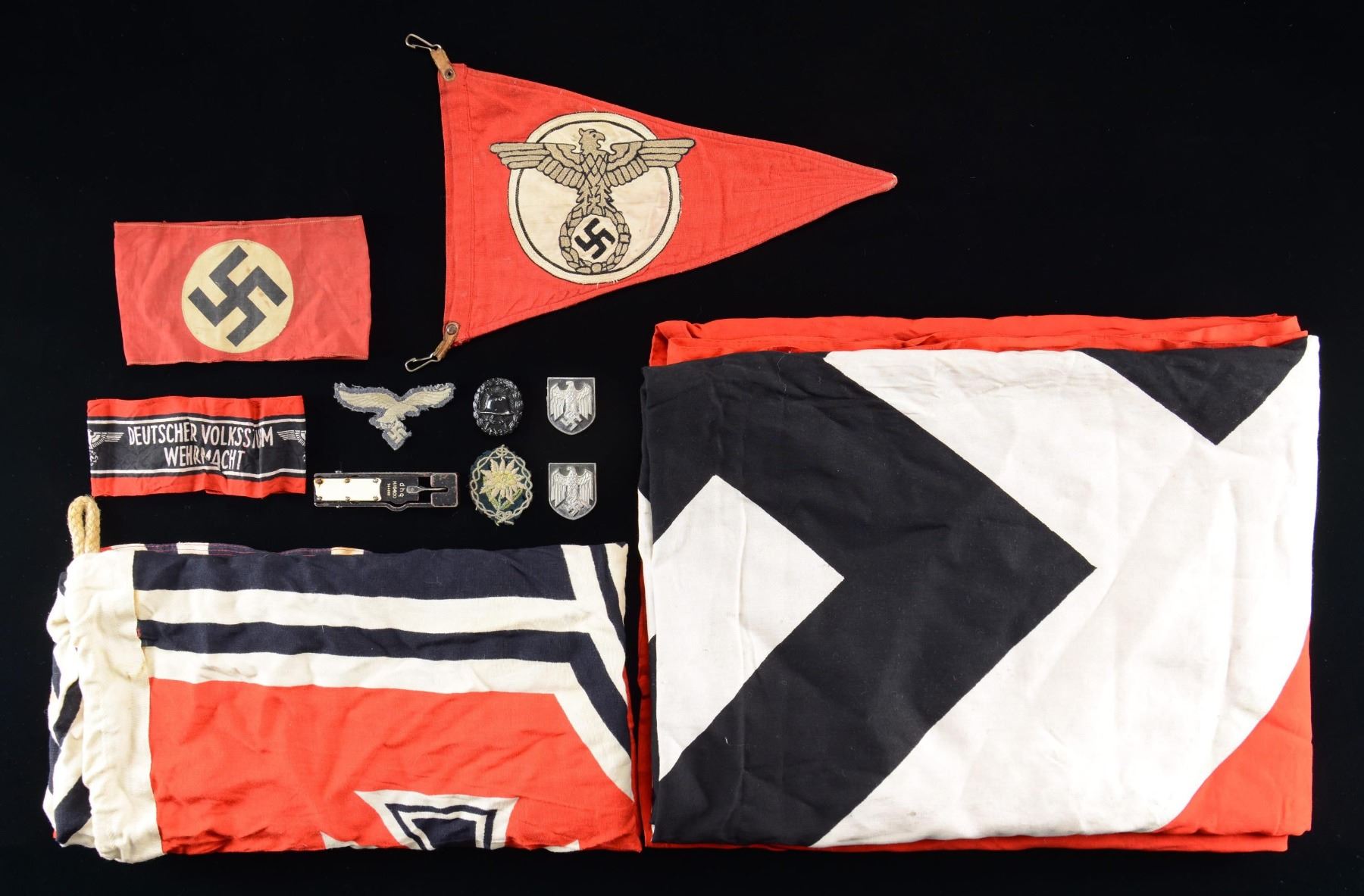 Lot 1492 WWII GERMAN FLAGS, ARMBANDS, INSIGNIA, A