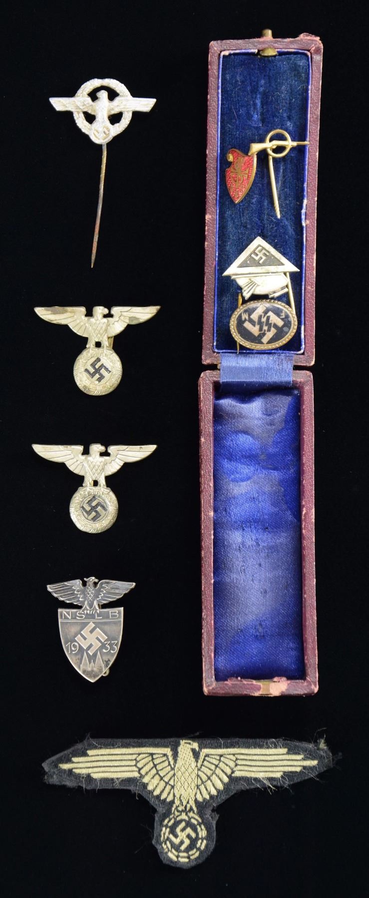 This intriguing lot consists of 1 black enamel SS F M stickpin, marked on the reverse "CC 32318 GES GESCH DESCHLER MOHN. 9". / 1 Stickpin with the insignia of the Society of German Culture, marked on the reverse "GES. GESCH." / 1 Gold-colored stickpin that features a rifle piercing a ring. / 1 Stickpin for the Gymnastics & Sport Society. / 1 Stickpin with a very early police eagle. / 1 Small leather original box housing the above five stickpins. / 1 Cloth Bevo weave SS breast eagle. / 2 Early style political cap eagles, each with one pin. / 1 Silver badge for the NSLB, the German National Socialist Teachers League. The badge is stamped "800" on the reverse, and the foot of the pin is stamped "GES. GESCH." CONDITION: all items show light wear and are complete, except as noted above. (02-23213-1/BF). $400-700.