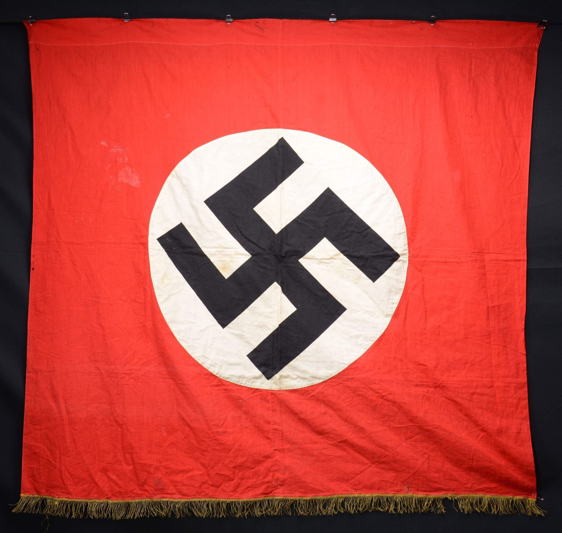 1) An exceptionally large WWII German RAD flag measuring approx. 133 1/2" x 88”. The flag features a printed black RAD insignia on a printed white circular disc, all on a red field. The flag features a rope halyard with original metal spring clips on each end. The flag is made in two pieces with a central length-wise seam because of its great size. CONDITION: flag shows light wear overall with no notable damage or staining. 2) A high-grade WWII German party flag measuring approx. 52” x 57” with 2” gold fringe at the end. The flag features a printed party symbol on a sewn white circular disc, all on a red field. CONDITION: flag shows minor staining with a few scattered holes, likely from insect damage. (02-23213-6/BF). $400-700.