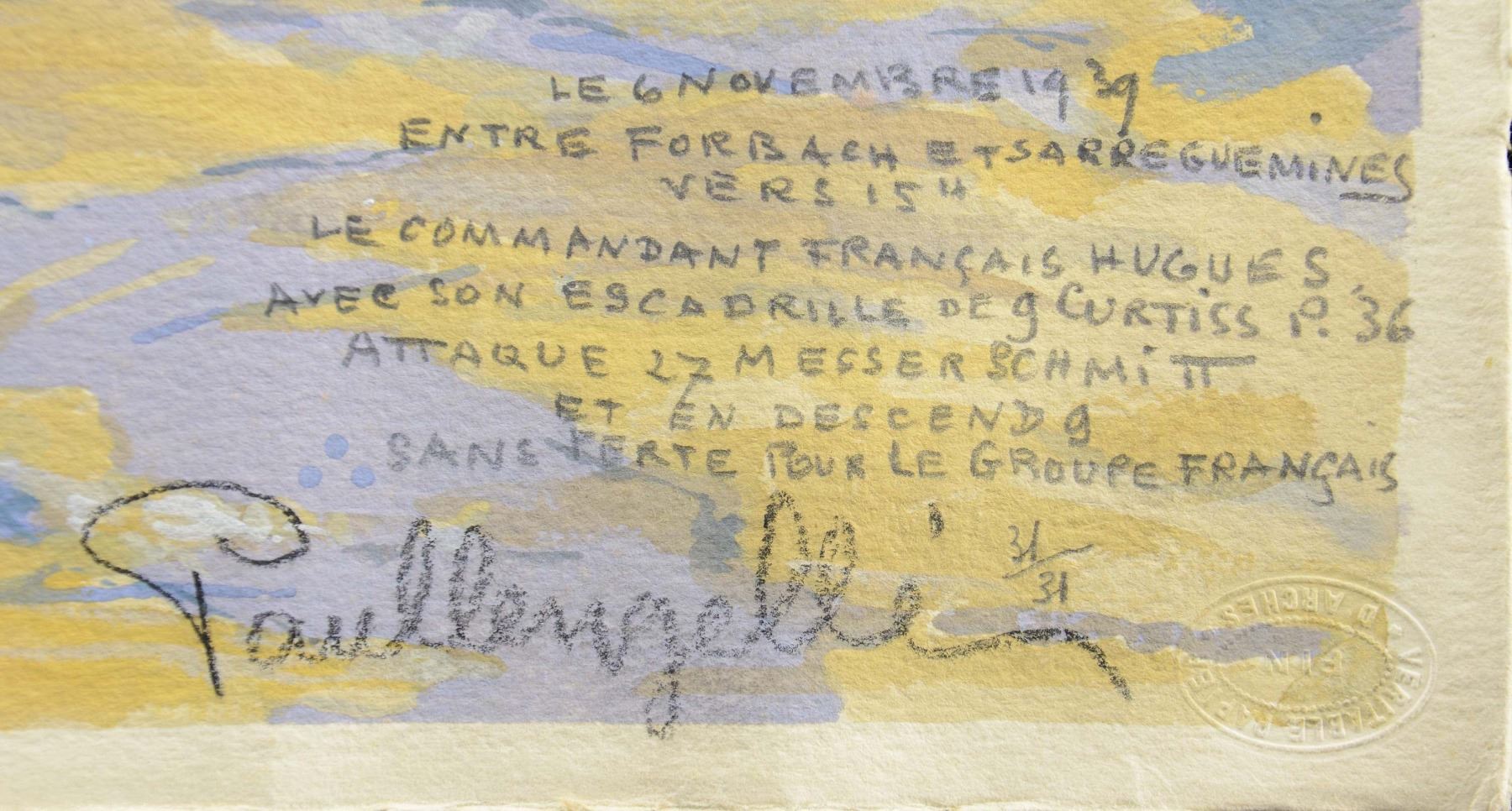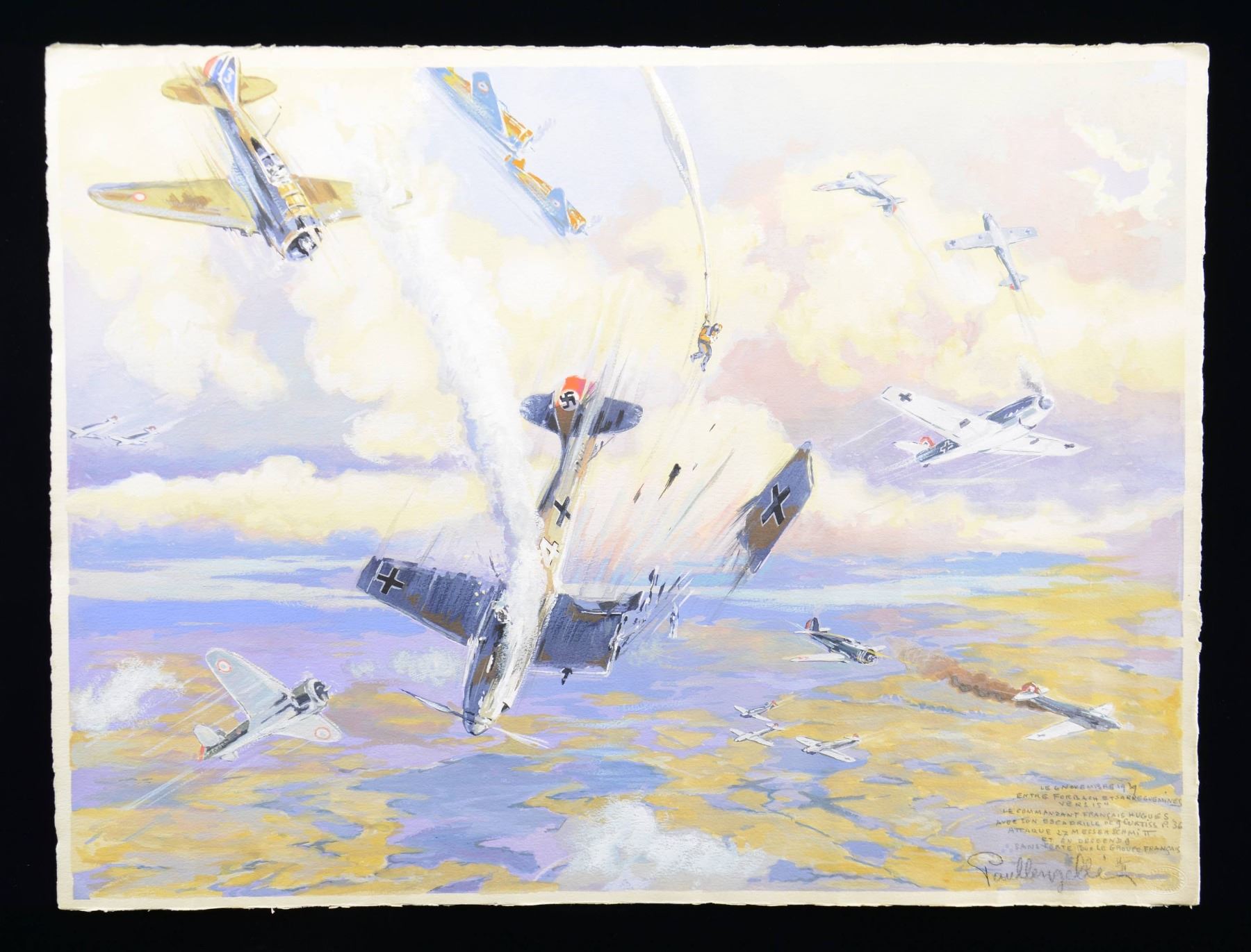 FRENCH DOG FIGHT. This unframed painting shows a dog fight between WWII German Messerschmitt aircraft and French Curtiss P36 aircraft. There is also a parachuted pilot, presumably from a downed German aircraft in the center of the painting. The painting is dated "6 NOVEMBRE 1939" within an inscription in the bottom right-hand corner of the painting. The painting is boldly signed "Paullengelle" at the bottom right-hand corner, along with an impressed mark. The overall size of the painting is approx. 22 3/4" x 30 1/4". This would be a striking centerpiece for any WWII aviation collection. CONDITION: painting shows no damage, and all colors are exceptionally vibrant. (02-23091/BF). $300-500.
