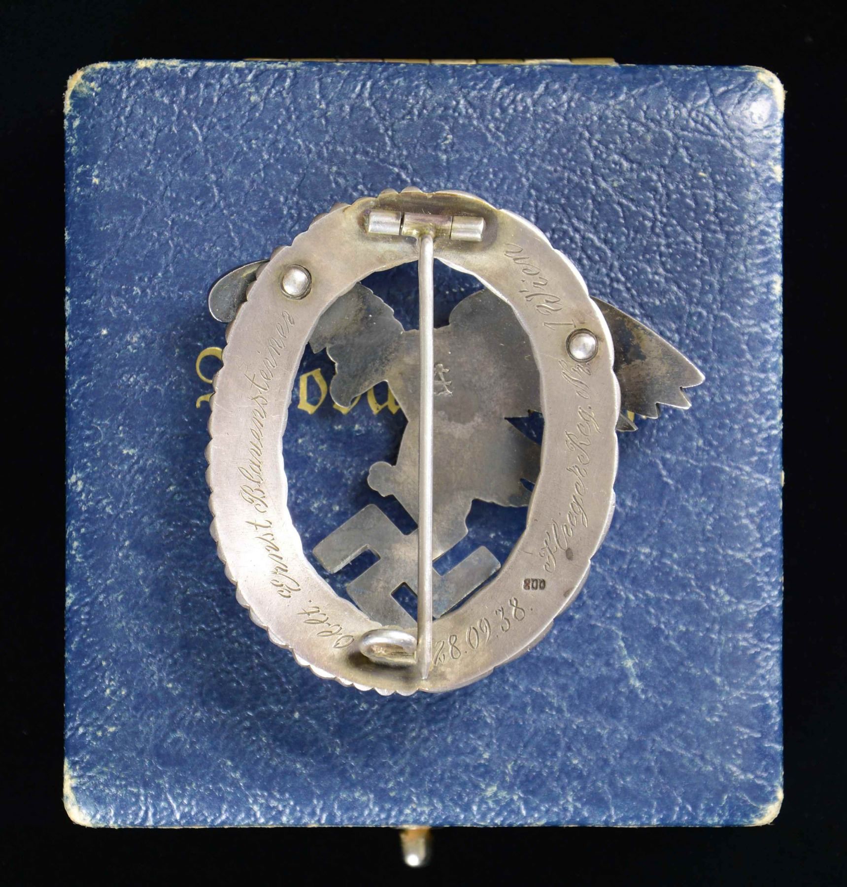 This badge features a flying eagle grasping a party symbol superimposed over an oak leaf and laurel leaf wreath. The back of the eagle has a stylized "A" for Assman. The eagle is attached by two rivets, and the wreath is stamped "800". The wreath is professionally hand-engraved "Oblt. Ernst Blavensteiner 28.09.38. Fleiger Reg. Nr. 1 Wien". The original case has a dark blue, textured finish and is embossed "Beobachterabz." in gold on the lid. The interior has blue velvet with a blue silk-like pillow. This badge is exceptionally well made; however, we feel, due to variations in manufacturing style and techniques not generally seen in Assman products, that this badge is a high-quality reproduction. CONDITION: badge shows expected wear both on the front and reverse. Case shows light to moderate wear with loss of finish at the corners. (02-23295-6/BF). $200-400.